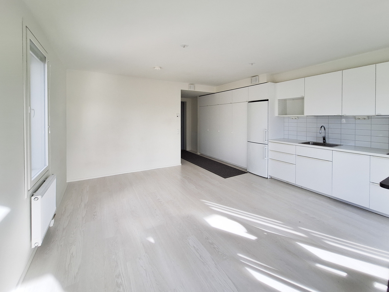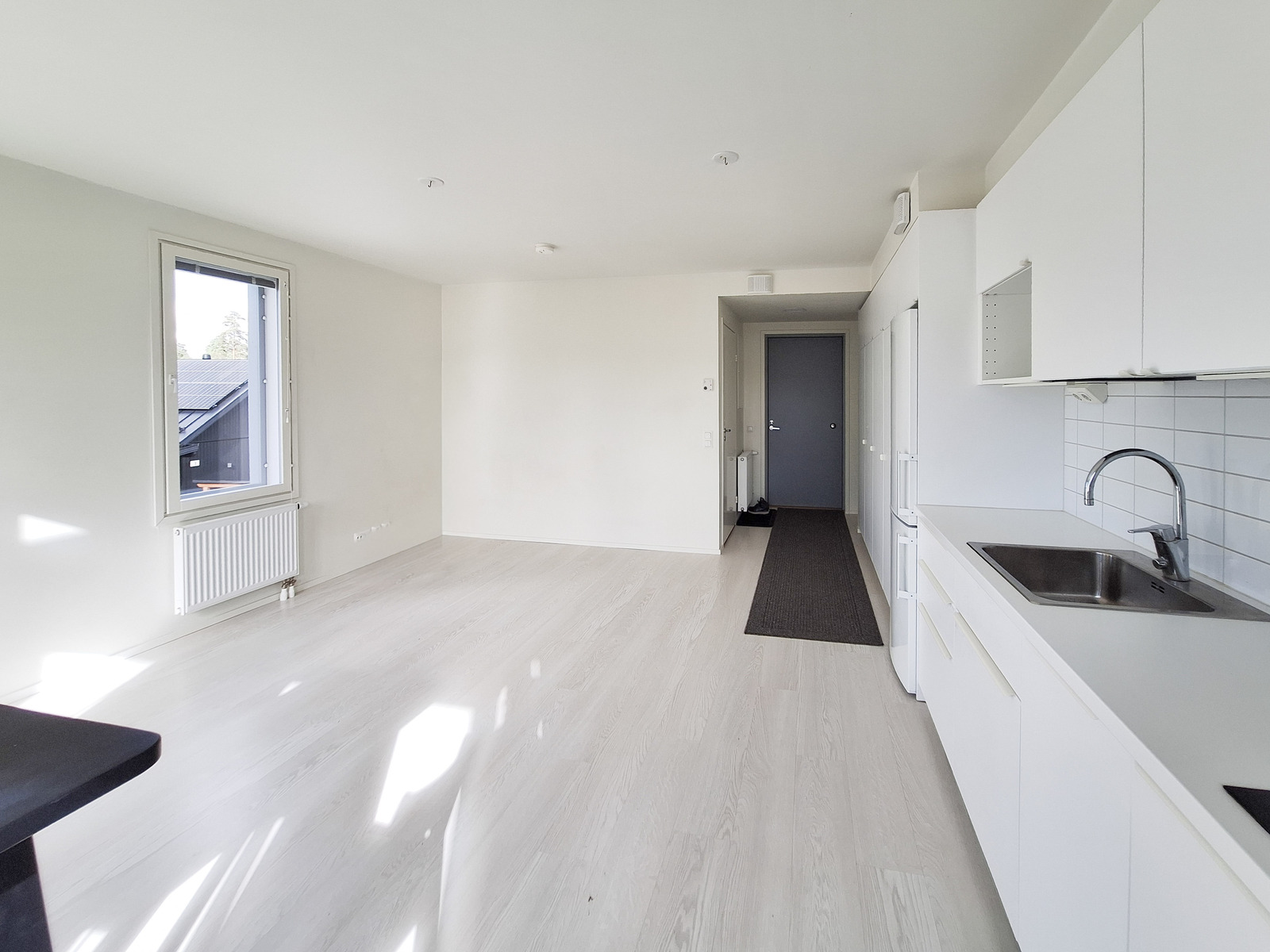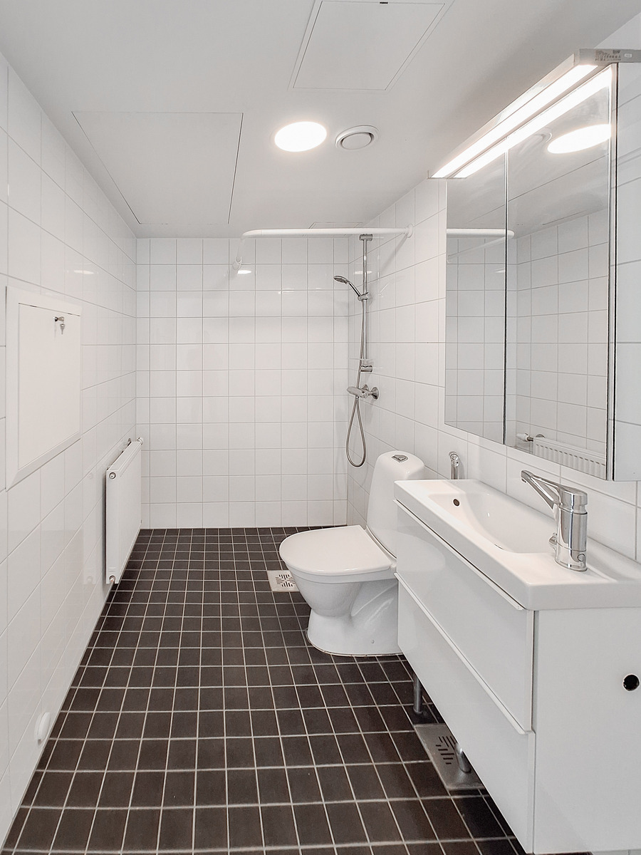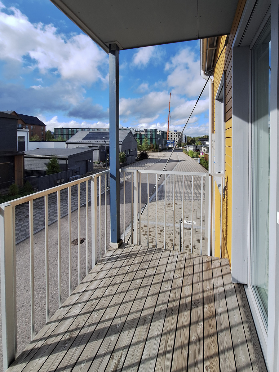 Tämä tilava yksiö on päätyasunto, joten luonnonvaloa tulee kahdesta eri suunnasta. Asunnon seinät ovat raikkaan valkoiset ja lattiat tyylikästä vaaleaa laminaattia. Tilavaan huoneeseen mahtuu helposti sekä sänky, sohva, että ruokapöytä. Modernista, kauniin vaaleasta keittiöstä löytyy kaikki tarvittava kotikokin tarpeisiin astianpesukoneineen ja induktioliesineen. Tyylikkäästi laatoitetussa kylpyhuoneessa on kääntyvät suihkuseinät ja pesukoneliitäntä sekä tilavaraus vaikka pesutornille. Olohuoneesta on käynti omalle parvekkeelle vehrein näkymin.