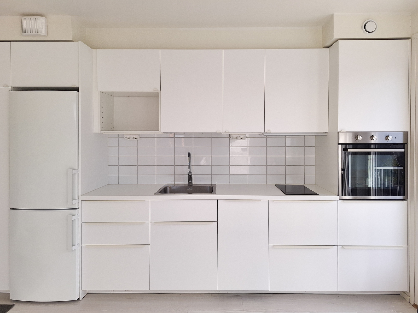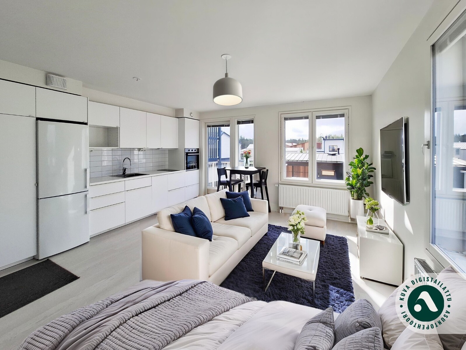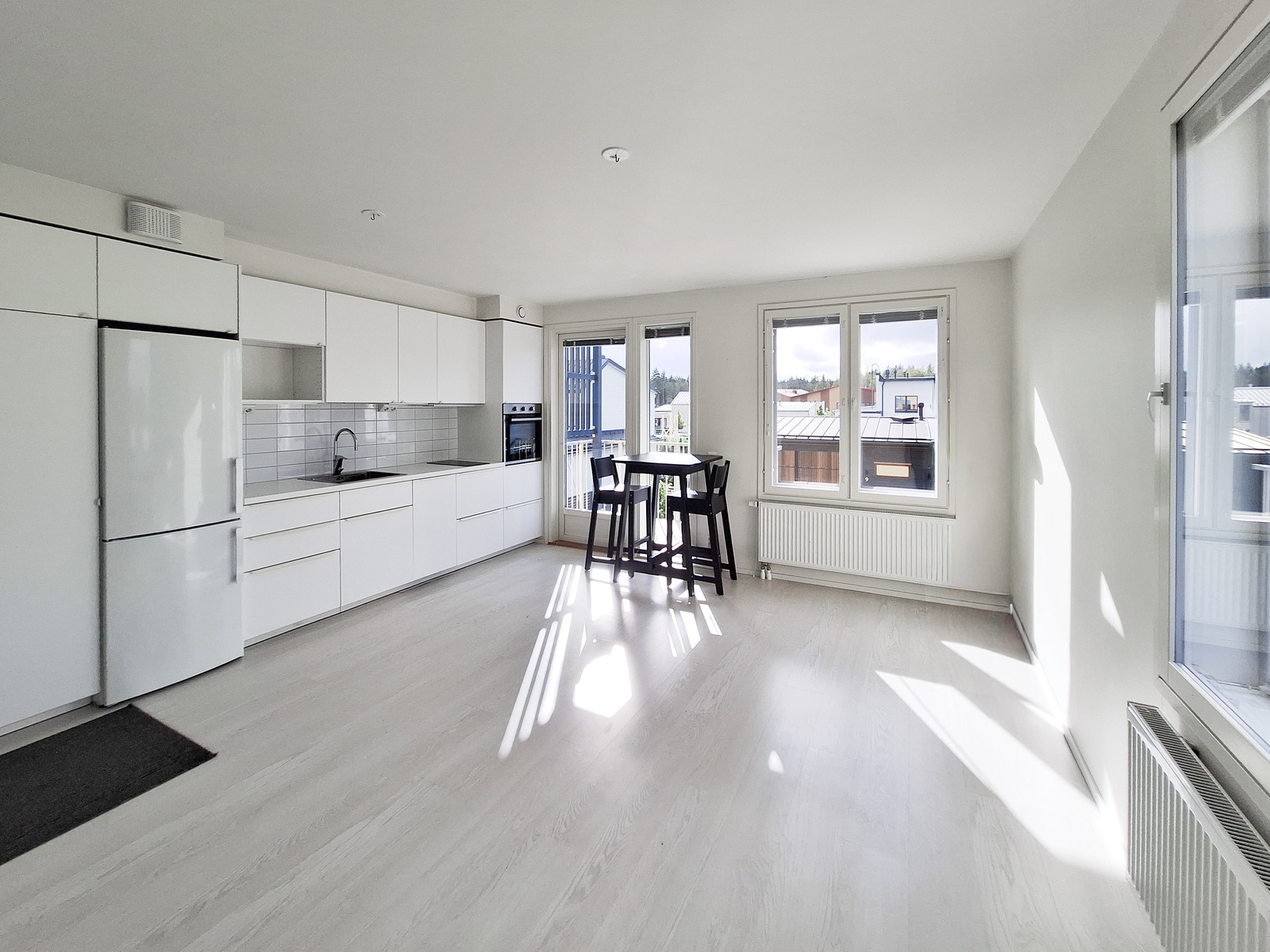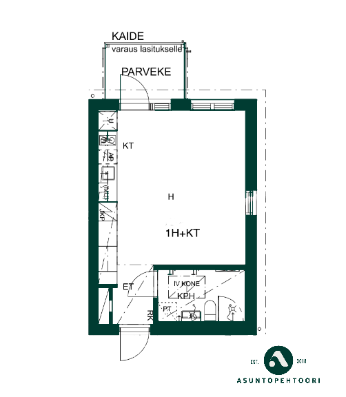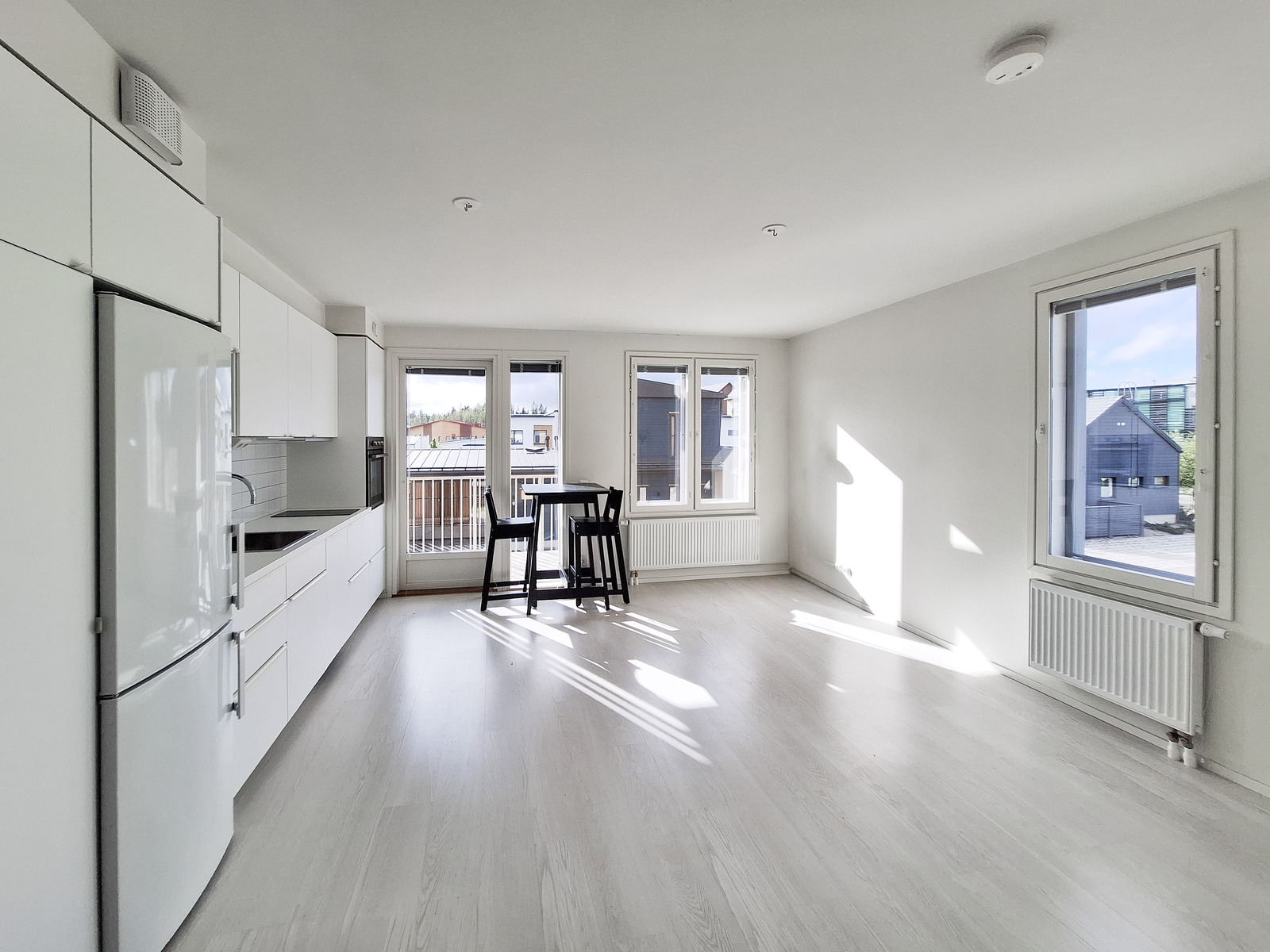 Tämä tilava yksiö on päätyasunto, joten luonnonvaloa tulee kahdesta eri suunnasta. Asunnon seinät ovat raikkaan valkoiset ja lattiat tyylikästä vaaleaa laminaattia. Tilavaan huoneeseen mahtuu helposti sekä sänky, sohva, että ruokapöytä. Modernista, kauniin vaaleasta keittiöstä löytyy kaikki tarvittava kotikokin tarpeisiin astianpesukoneineen ja induktioliesineen. Tyylikkäästi laatoitetussa kylpyhuoneessa on kääntyvät suihkuseinät ja pesukoneliitäntä sekä tilavaraus vaikka pesutornille. Olohuoneesta on käynti omalle parvekkeelle vehrein näkymin.