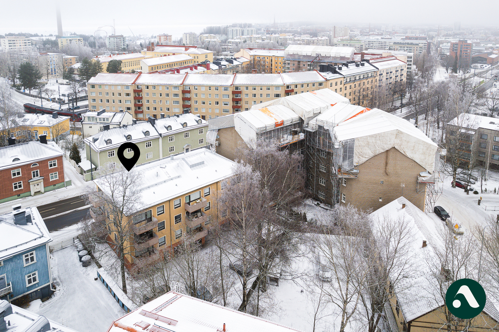 Tässä tilavassa yksiössä on toimiva ja viihtyisä pohjaratkaisu, jossa sekä keittiölle että sängylle on omat selkeät syvennyksensä. Ikkunoista avautuvat näkymät Pyynikin kauniisiin puutaloihin ja kirkkaalla säällä näkyy myös Näsinneula.. Asunto on valoisa kahdella seinällä olevien isojen ikkunoiden ansiosta ja parvekkeella pääsee nauttimaan kesäisin ilta-auringosta.