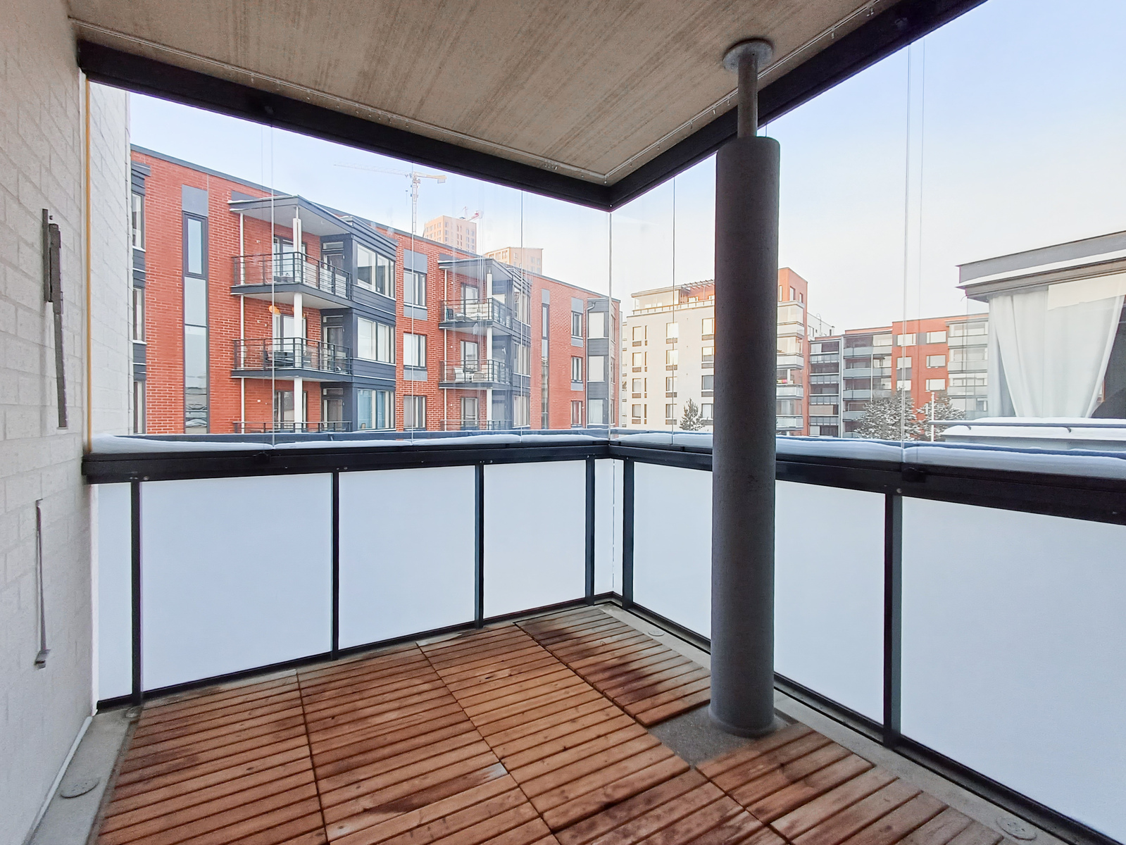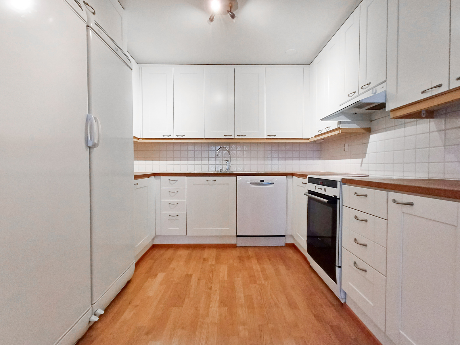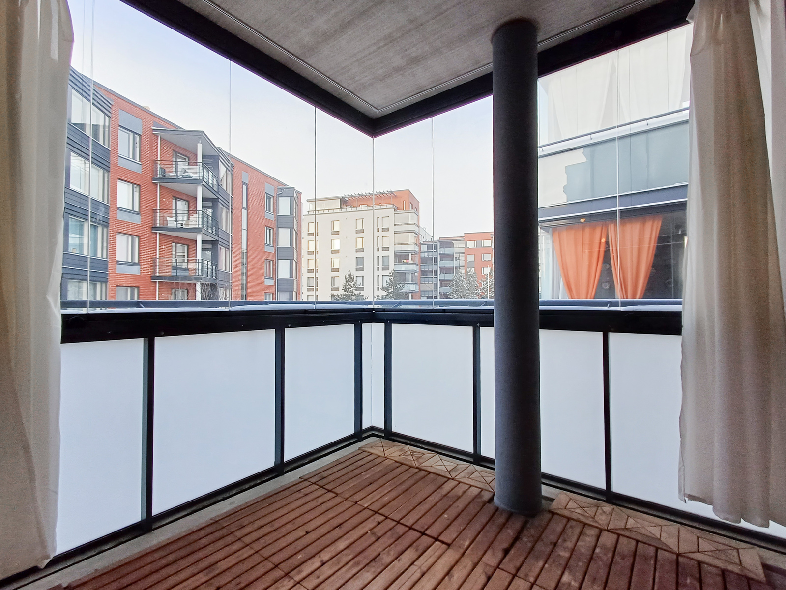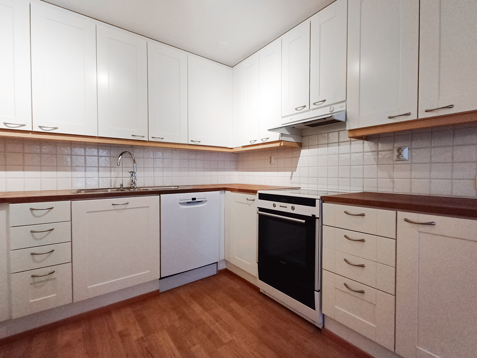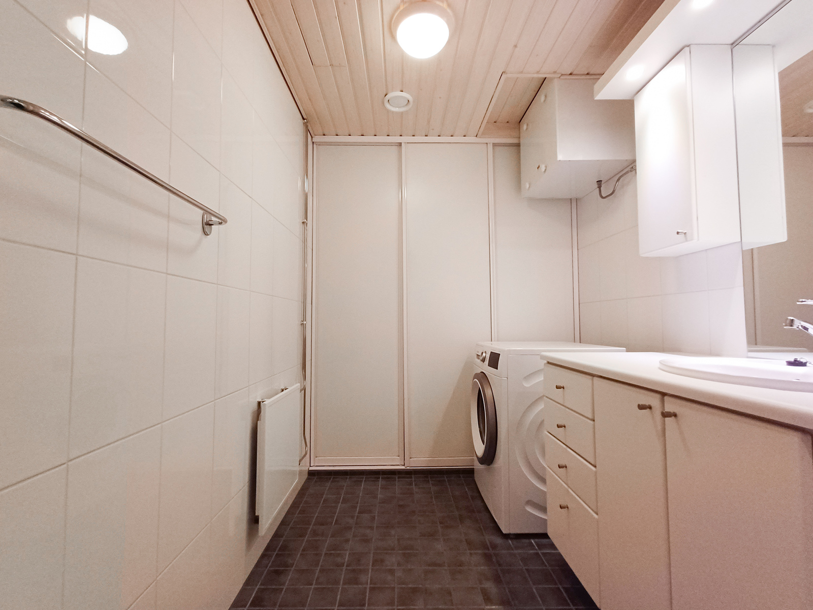 Tämä avara ja valoisa kolmen makuuhuoneen koti on varustettu kahdella lasitetulla parvekkeella ja omalla saunalla. Keittiö on hyvin varusteltu ja sisältää runsaasti laskutilaa. Keittiöstä löytyy kaikki tarvittava kotikokin tarpeisiin. Laatoitetussa kodinhoitohuoneessa on liitännät ja tilavaraukset pyykinpesukoneelle sekä säilytystilana kaapistot. Arjen sujuvuutta on helpottamassa myös toinen kylpyhuone ja erillinen wc. Eteisessä on säilytystilana kaksi peilikaapistoa.