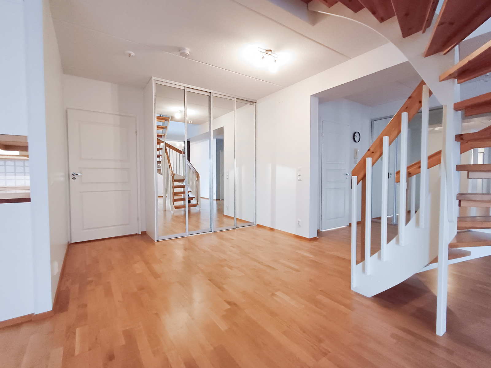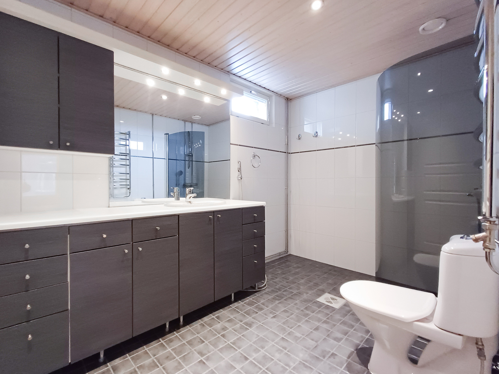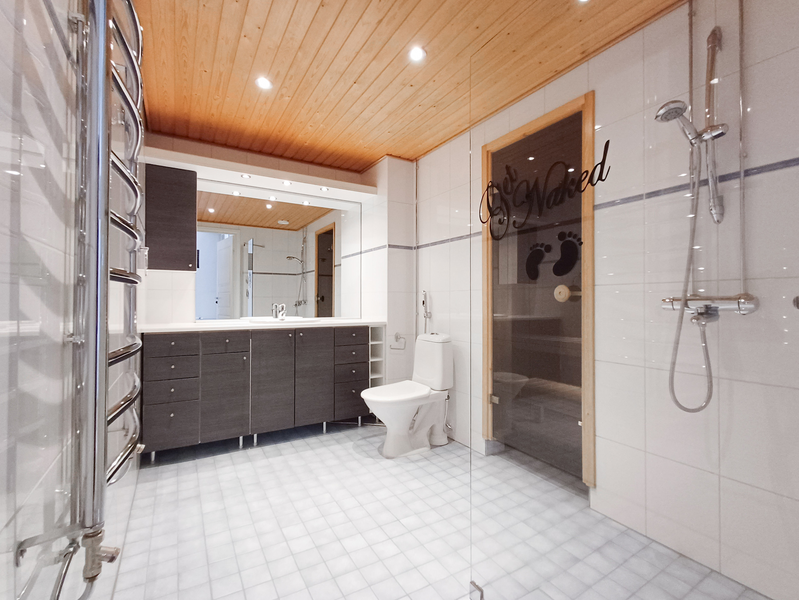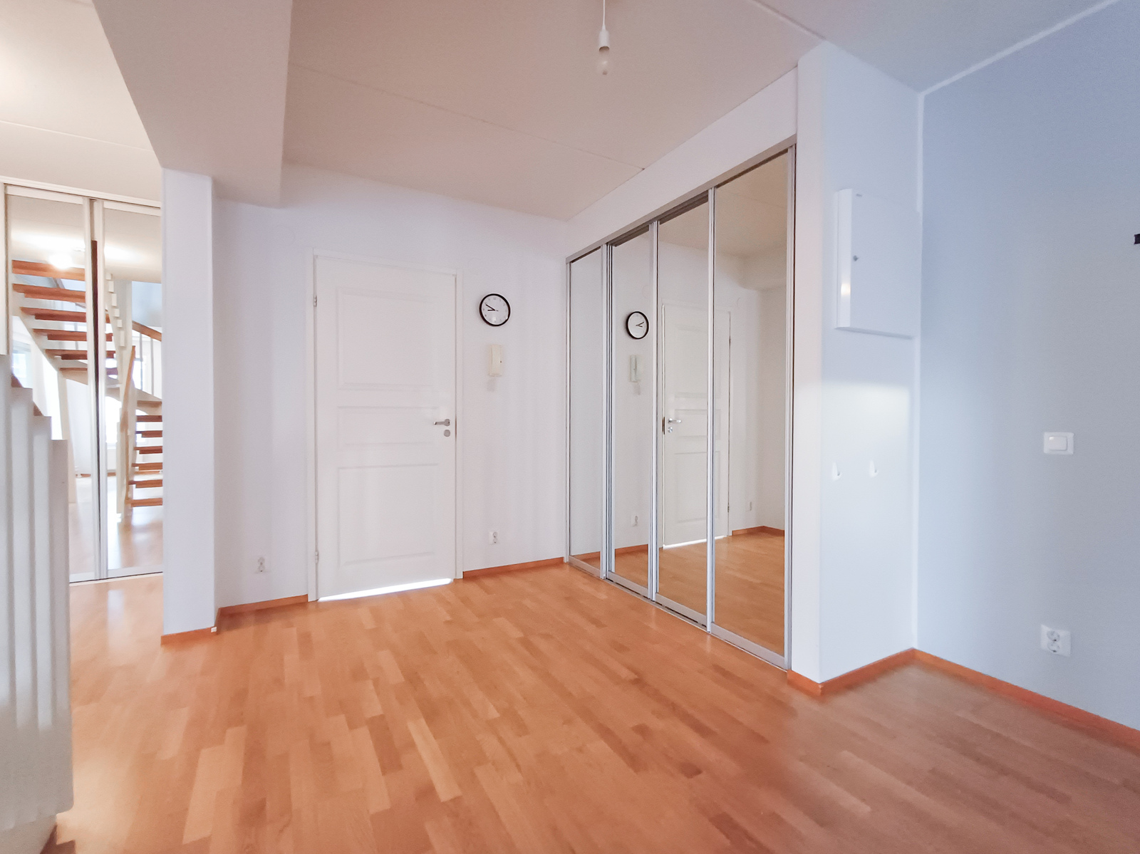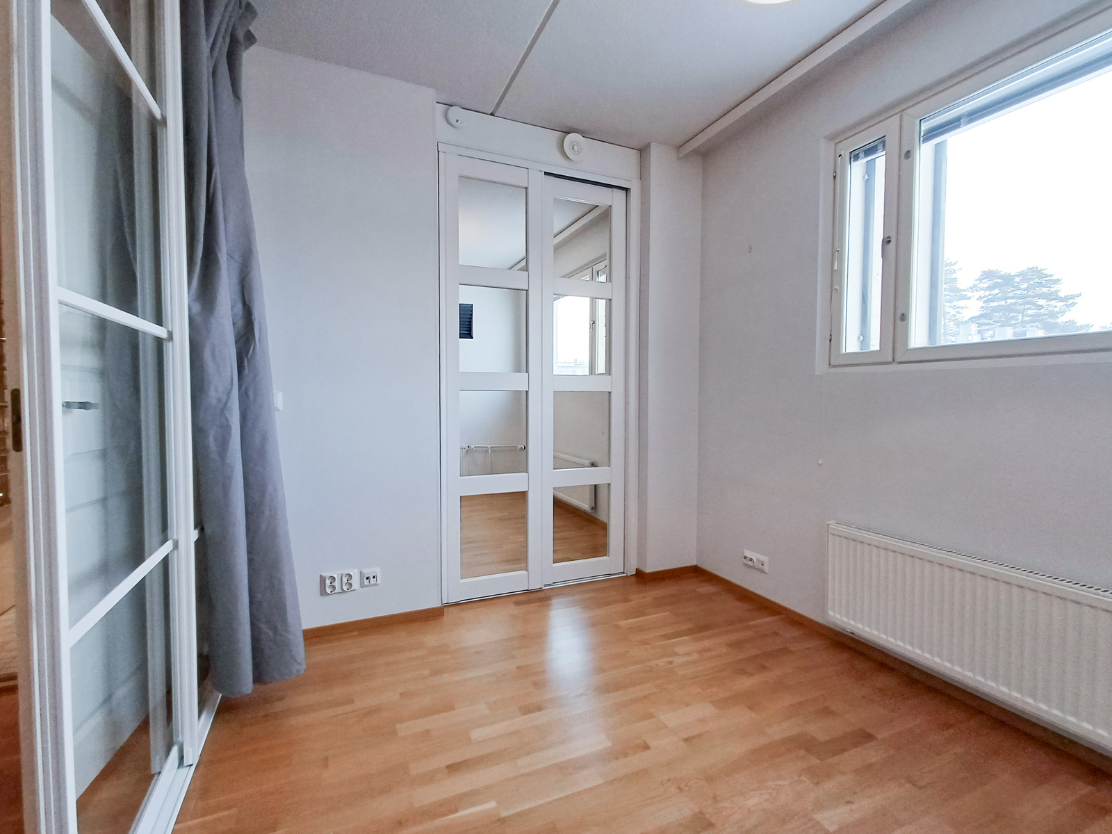 Tämä avara ja valoisa kolmen makuuhuoneen koti on varustettu kahdella lasitetulla parvekkeella ja omalla saunalla. Keittiö on hyvin varusteltu ja sisältää runsaasti laskutilaa. Keittiöstä löytyy kaikki tarvittava kotikokin tarpeisiin. Laatoitetussa kodinhoitohuoneessa on liitännät ja tilavaraukset pyykinpesukoneelle sekä säilytystilana kaapistot. Arjen sujuvuutta on helpottamassa myös toinen kylpyhuone ja erillinen wc. Eteisessä on säilytystilana kaksi peilikaapistoa.