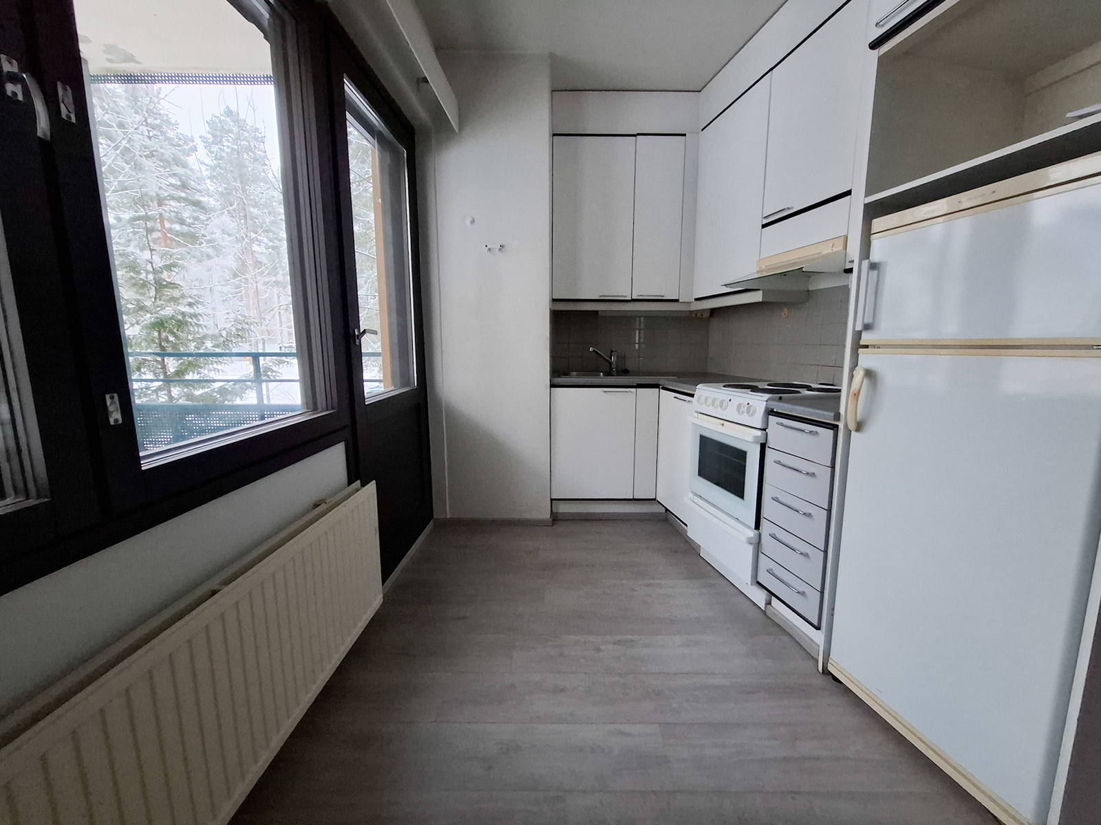 Asunnossa on laminaattilattia ja maalatut seinät. Keittiön kalusteisiin kuuluu liesi/uuni, jääkaappi pakastinlokerolla ja liesituuletin. Käynti parvekkeelle on keittiön kautta ja siihen mahtuu myös pieni pöytäryhmä.