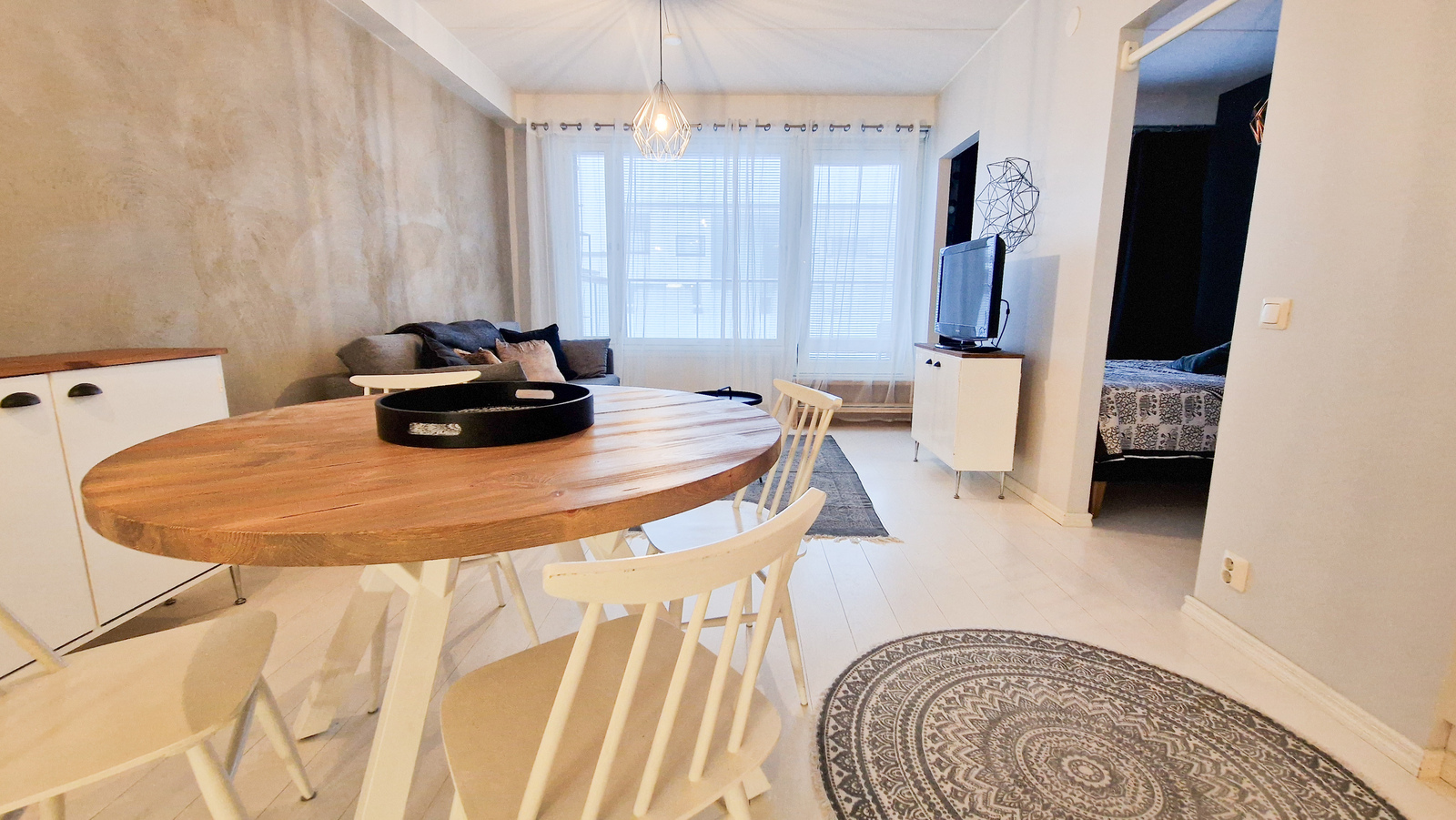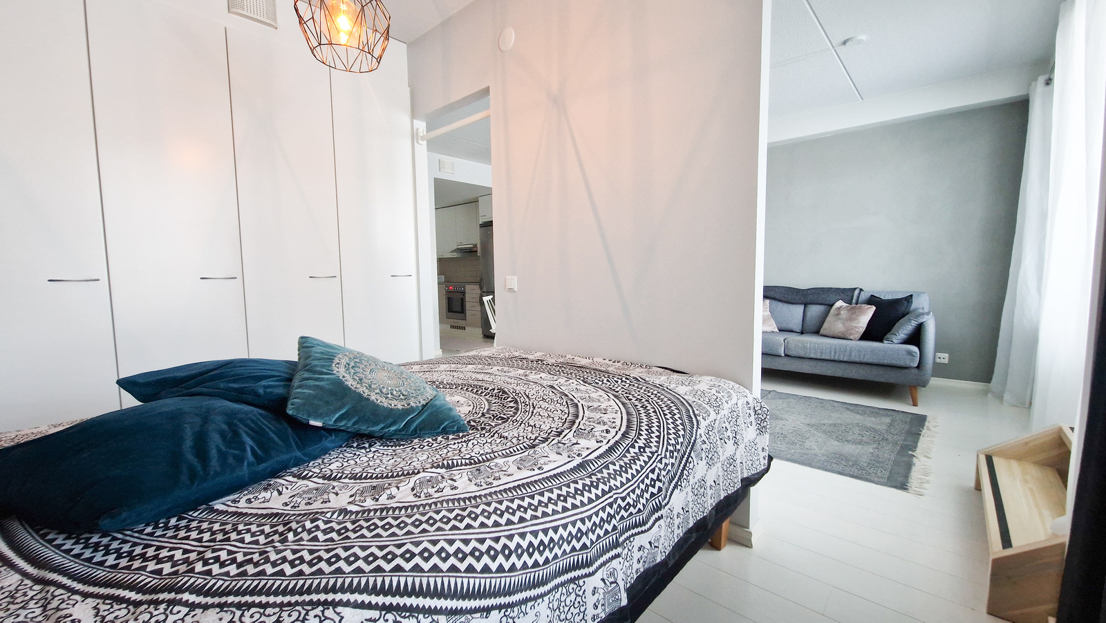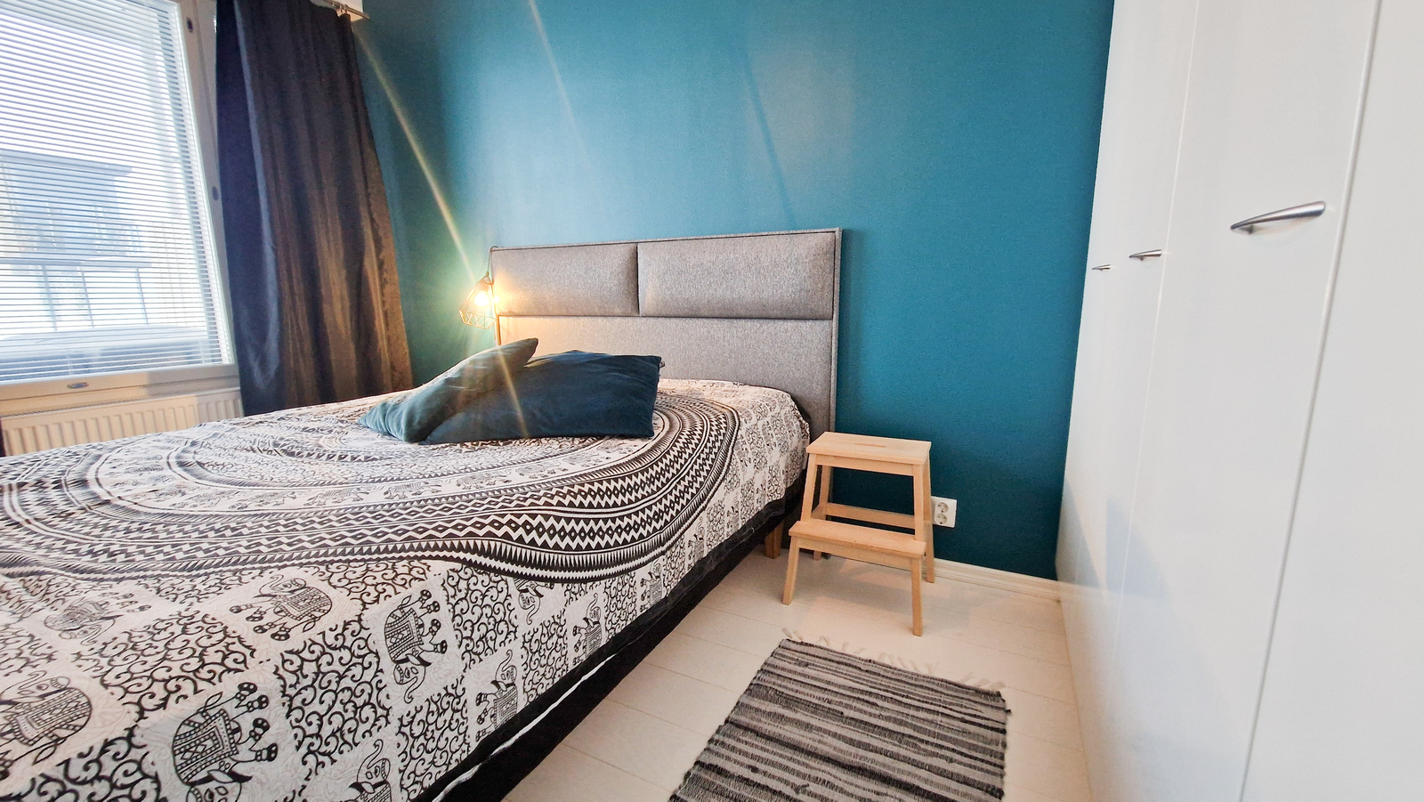 Keittiössä on kaikki tarvittava kokkailuun, ja ruokapöydälle on sopiva paikka heti olohuoneen puolella. Makuuhuoneeseen mahtuu parisänky, ja vaatekaappejakin löytyy muutama.