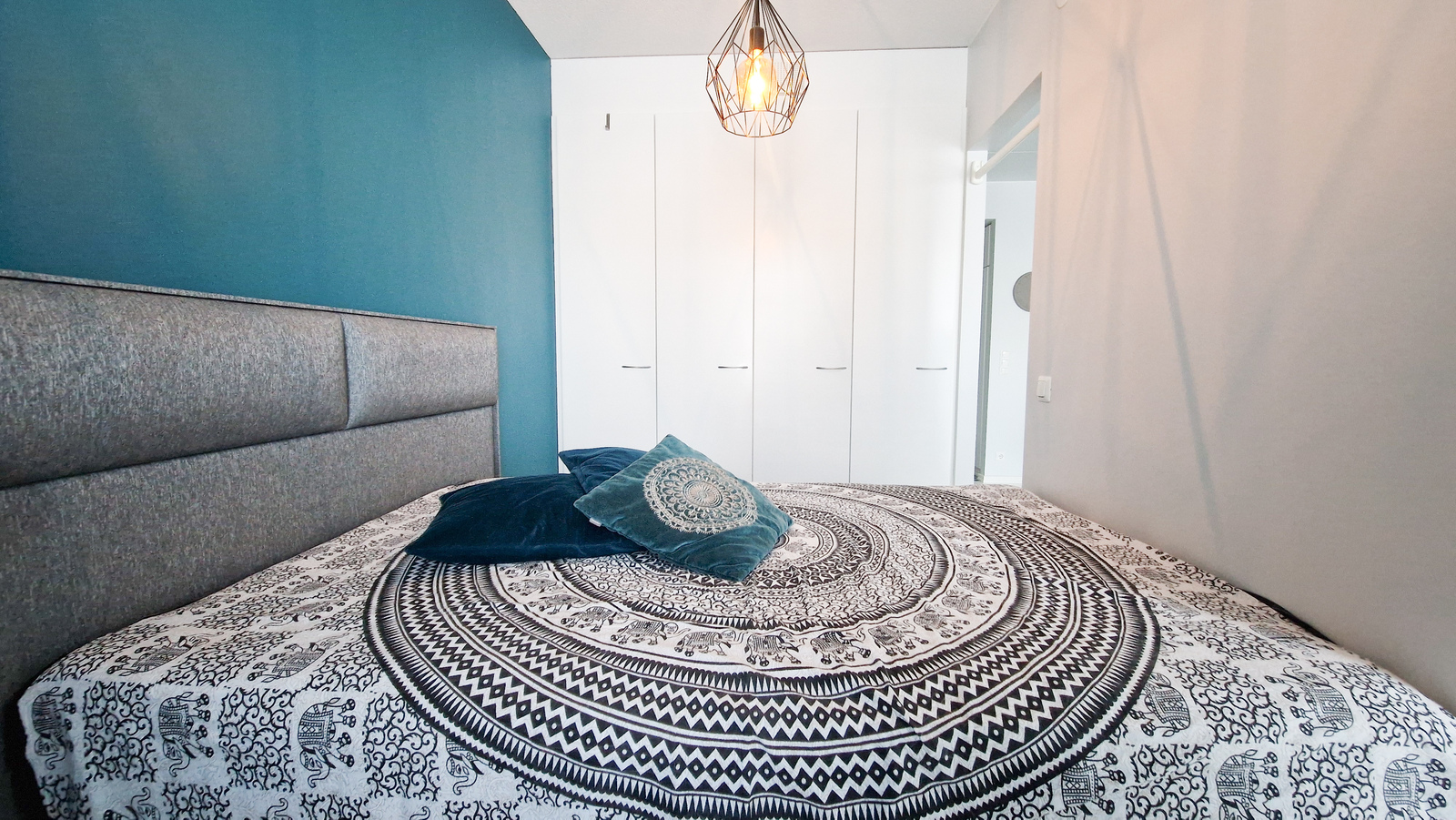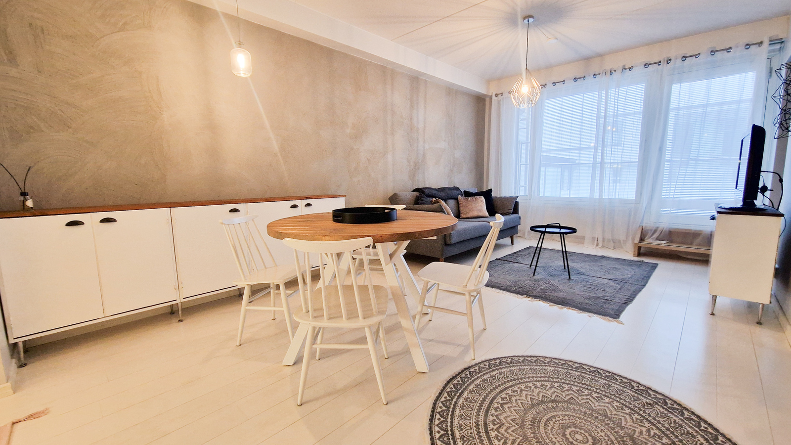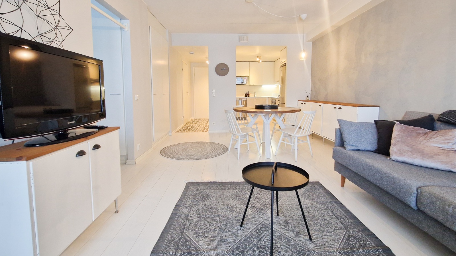 Keittiössä on kaikki tarvittava kokkailuun, ja ruokapöydälle on sopiva paikka heti olohuoneen puolella. Makuuhuoneeseen mahtuu parisänky, ja vaatekaappejakin löytyy muutama.