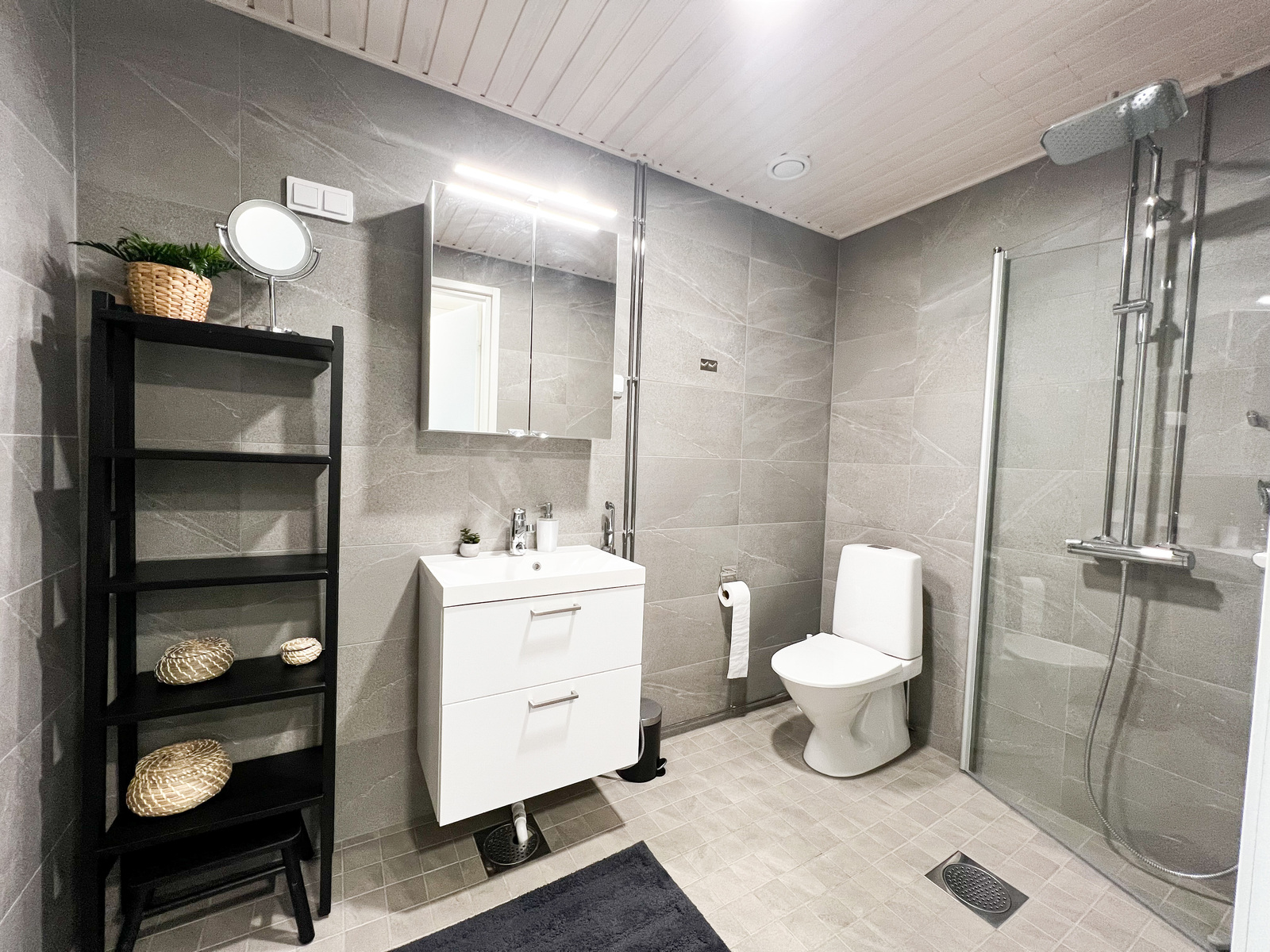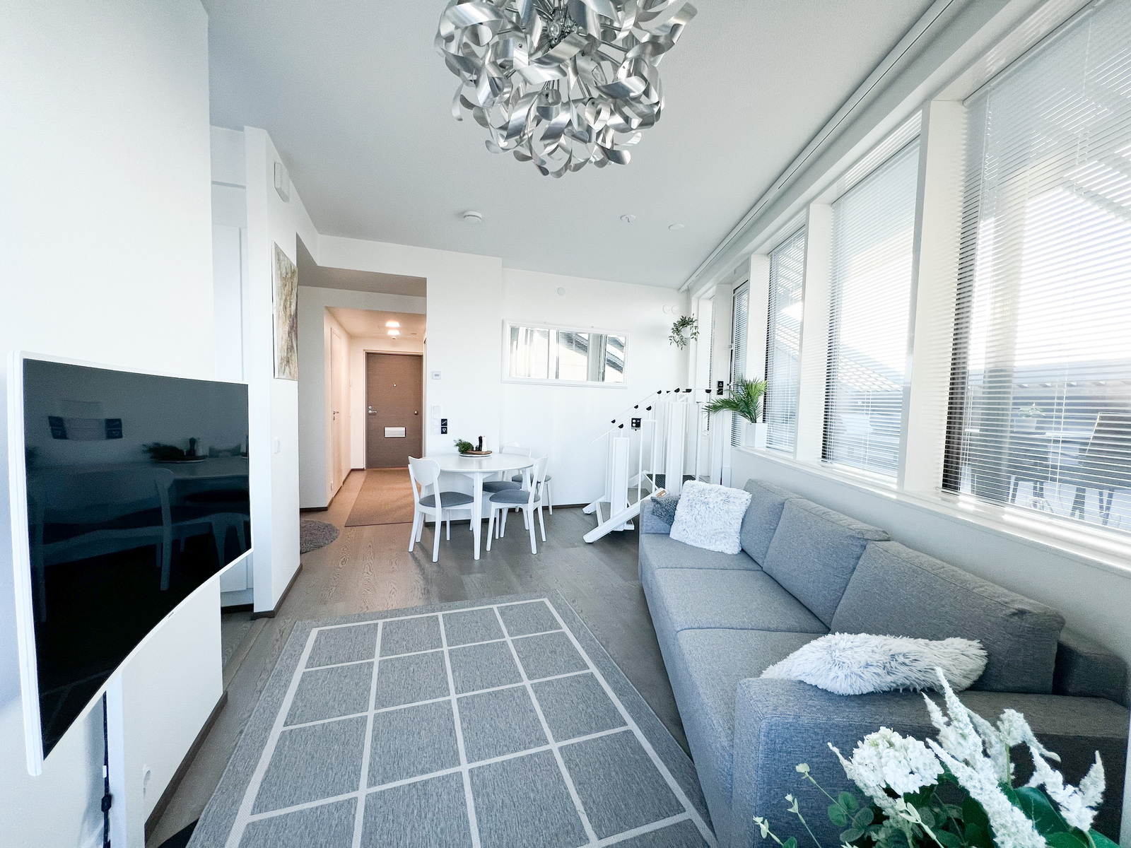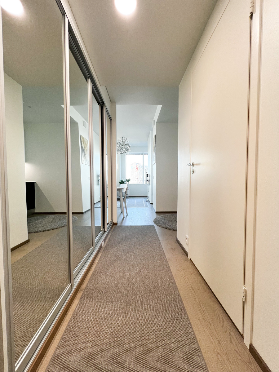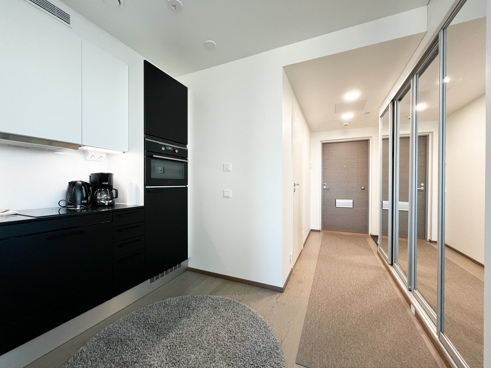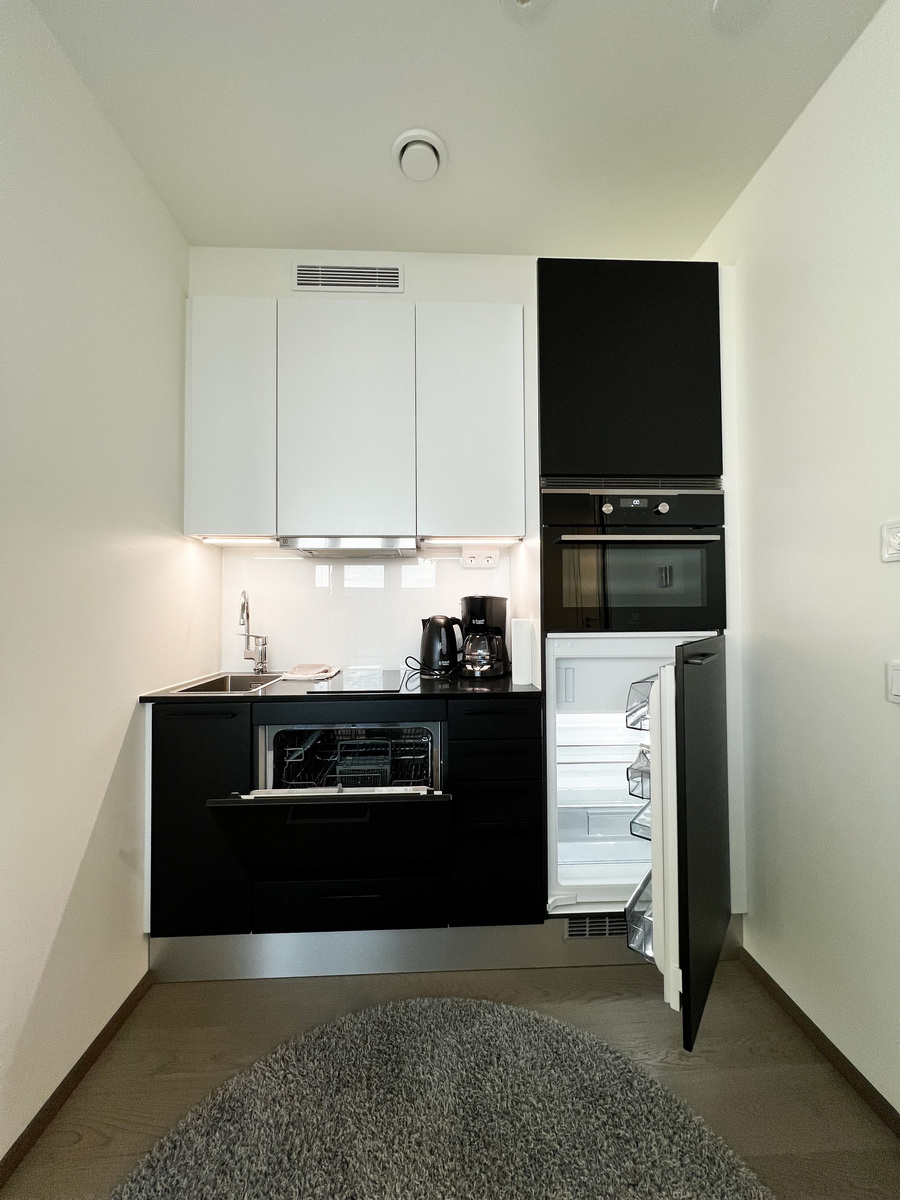 Asunnon keittiöstä löytyvät kaikki tarvittavat varusteet kuten induktioliesi, pieni astianpesukone sekä kätevä uuni/mikro-yhdistelmä. Pesuhuone on tilava ja sieltä on luonnollisesti liitäntä pyykinpesukoneelle. Laajakaistayhteys (nopeus 50 Mbit/s) sisältyy vuokraan.