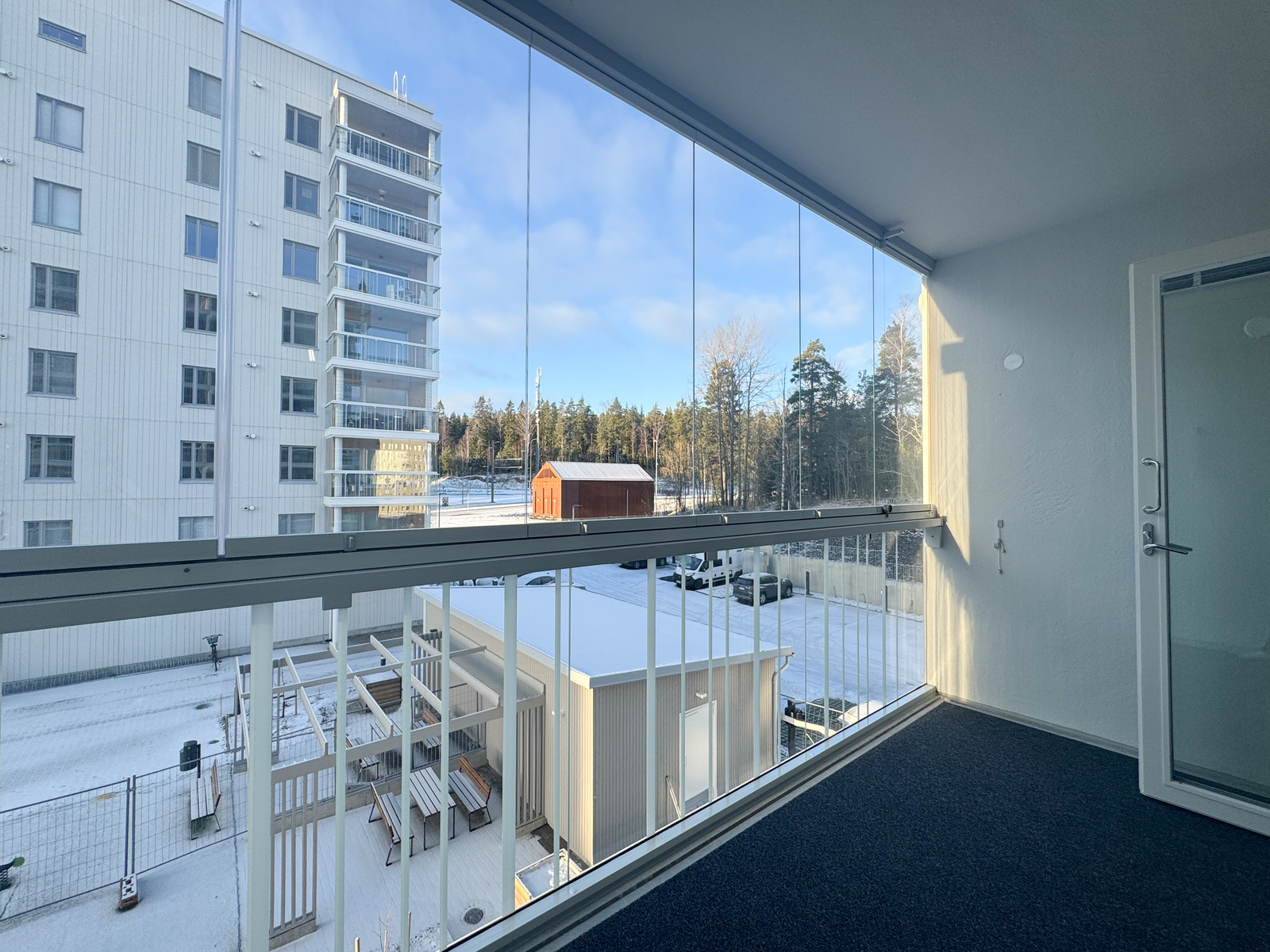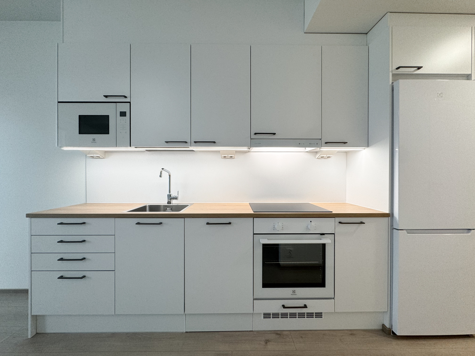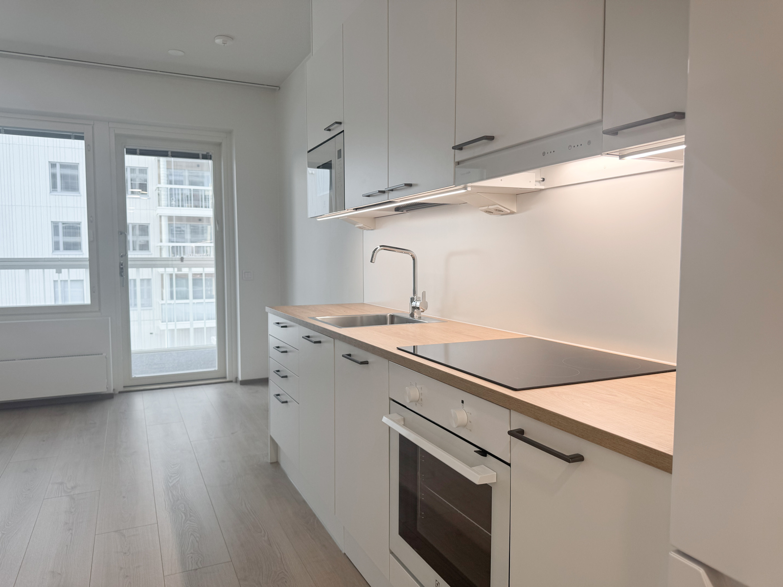 Keittiö ja oleskelutila muodostavat saumattoman kokonaisuuden, jossa arki sujuu mutkattomasti. Moderni keittiö on varustettu integroiduilla kodinkoneilla, kuten astianpesukoneella ja mikroaaltouunilla sekä tilava alkovi tarjoaa selkeän paikan sängylle mikä helpottaa muun tilan kalustamista. Tyylikkäästi laatoitetussa kylpyhuoneessa on liitäntä pyykinpesukoneelle ja mukavuutta asumiseen tuo lasitettu parveke, joka toimii viihtyisänä lisätilana aikaisesta keväästä pitkälle syksyyn.