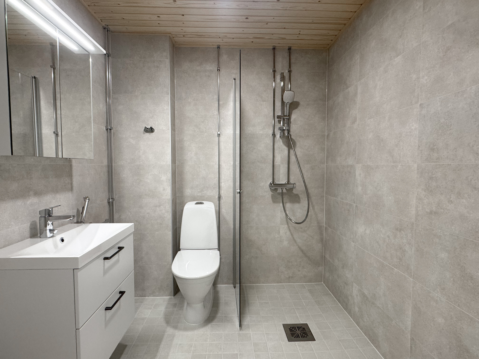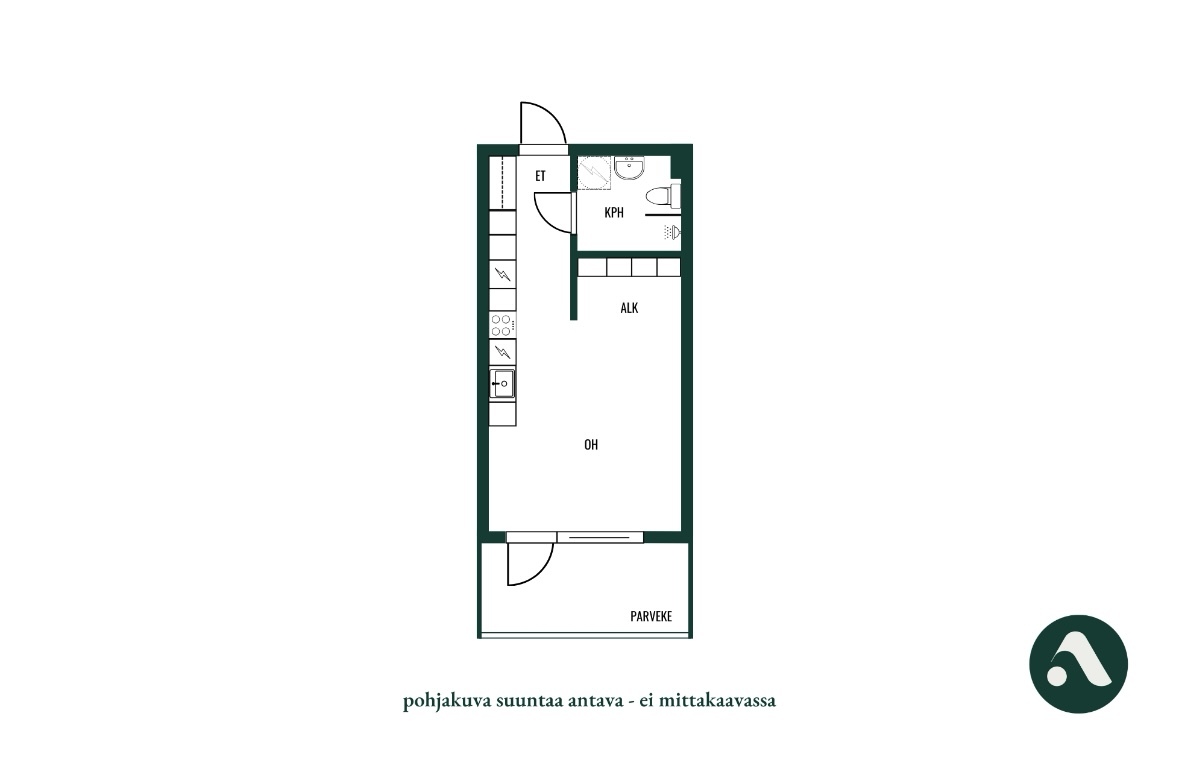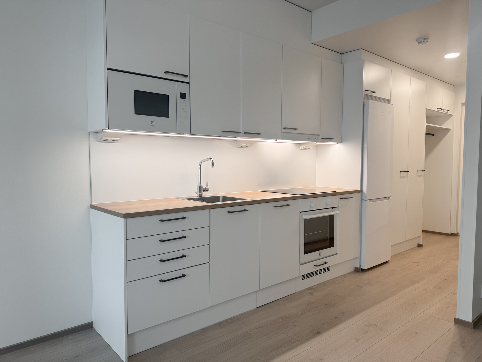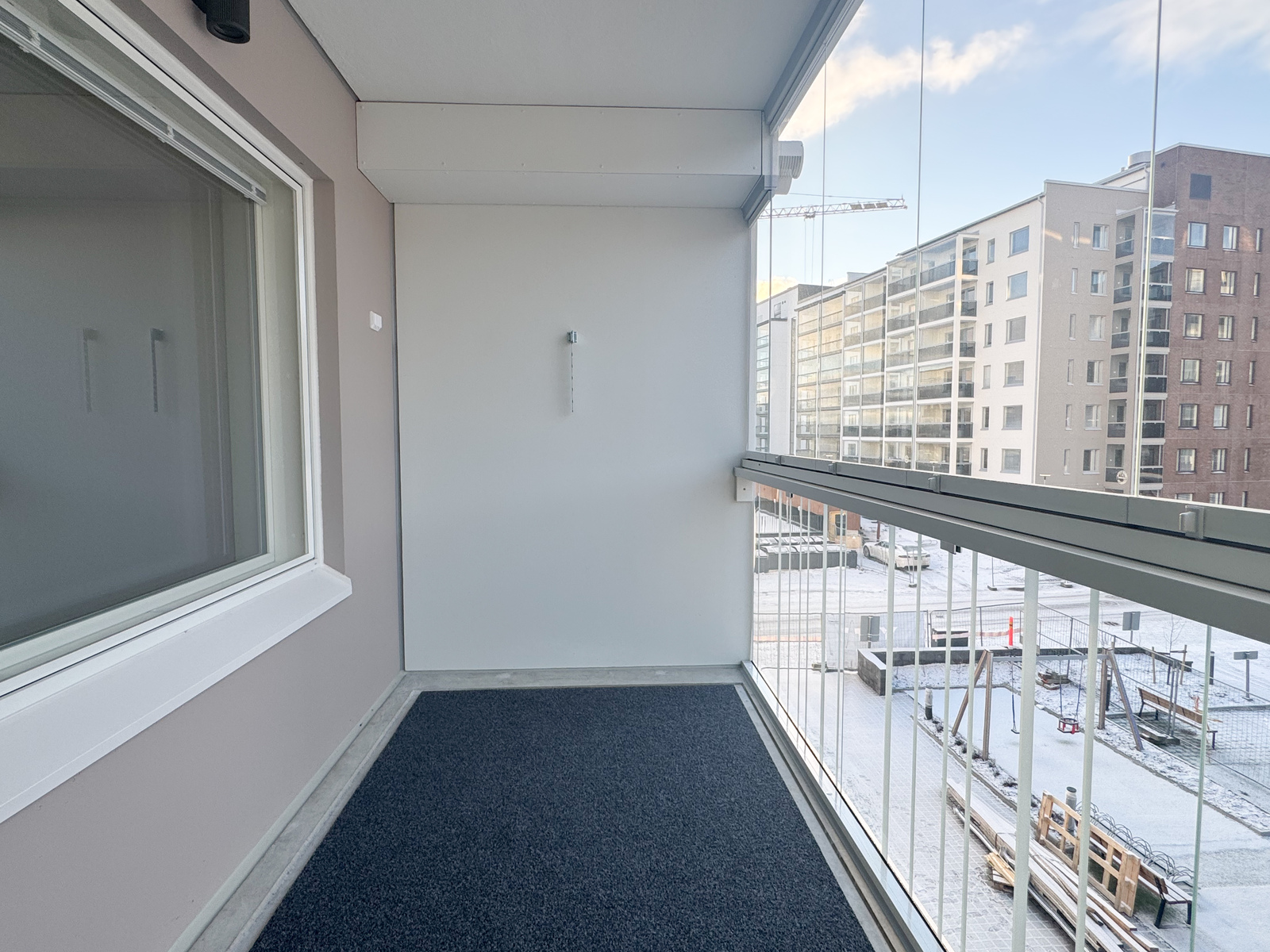 Keittiö ja oleskelutila muodostavat saumattoman kokonaisuuden, jossa arki sujuu mutkattomasti. Moderni keittiö on varustettu integroiduilla kodinkoneilla, kuten astianpesukoneella ja mikroaaltouunilla sekä tilava alkovi tarjoaa selkeän paikan sängylle mikä helpottaa muun tilan kalustamista. Tyylikkäästi laatoitetussa kylpyhuoneessa on liitäntä pyykinpesukoneelle ja mukavuutta asumiseen tuo lasitettu parveke, joka toimii viihtyisänä lisätilana aikaisesta keväästä pitkälle syksyyn.