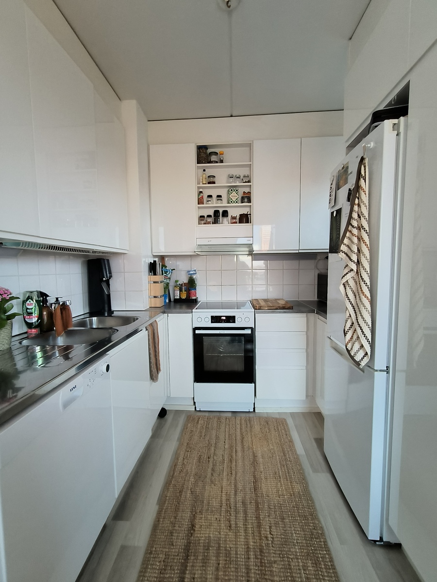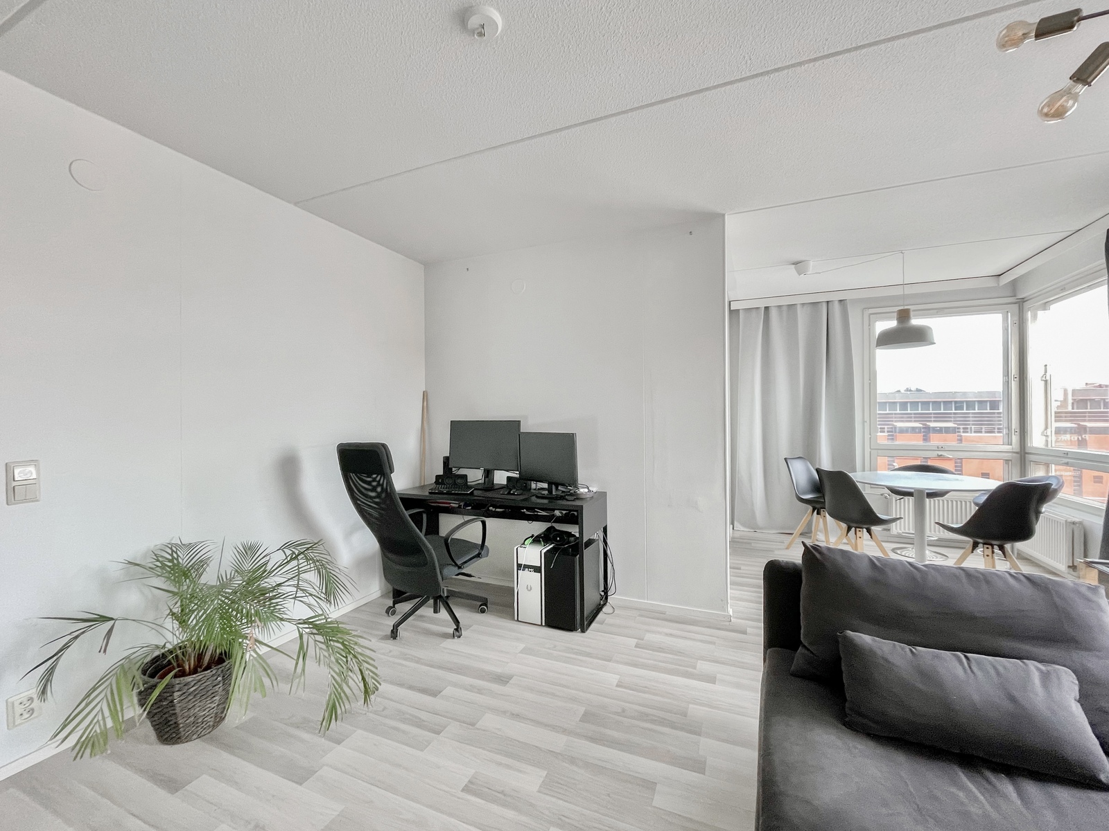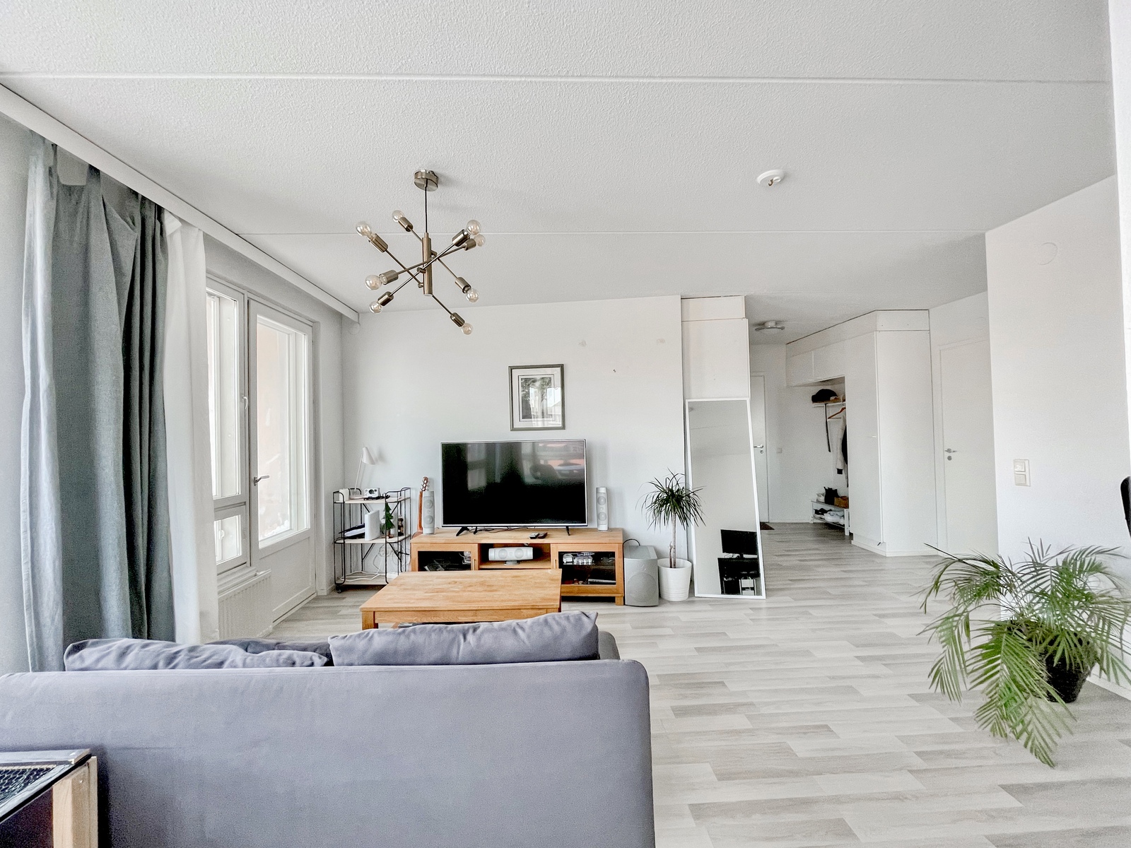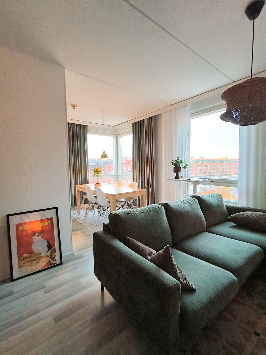 Hyvän pohjaratkaisun ja lukuisien ikkunoiden ansiosta koti on avara ja valoisa. Avaran olohuoneen yhteydessä on hyvänkokoinen keittiö ja ruokailutila. Keittiössä on hyvin kaappi- ja laskutilaa ja kaikki tarvittavat kodinkoneet sujuvaan arkeen. Olohuoneen nurkkaan sopii täydellisesti esimerkiksi etätyöpiste. Tilava ja moderni kylpyhuone on remontoitu vuonna 2020 ja sieltä löytyy pyykinpesukoneliitäntä. Säilytystilaa on mukavasti eteisen ja makuuhuoneen kaapistoissa. Parvekkeelta ja ikkunoista upeat ylimmän kerroksen näkymät Kalasatamaan asti!