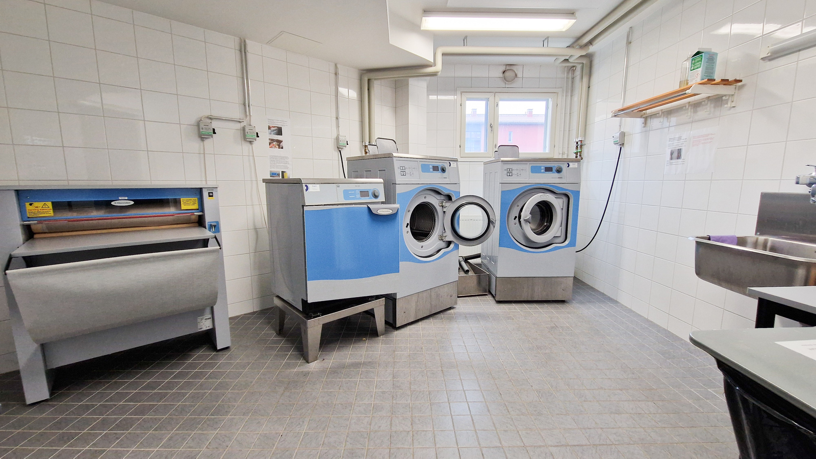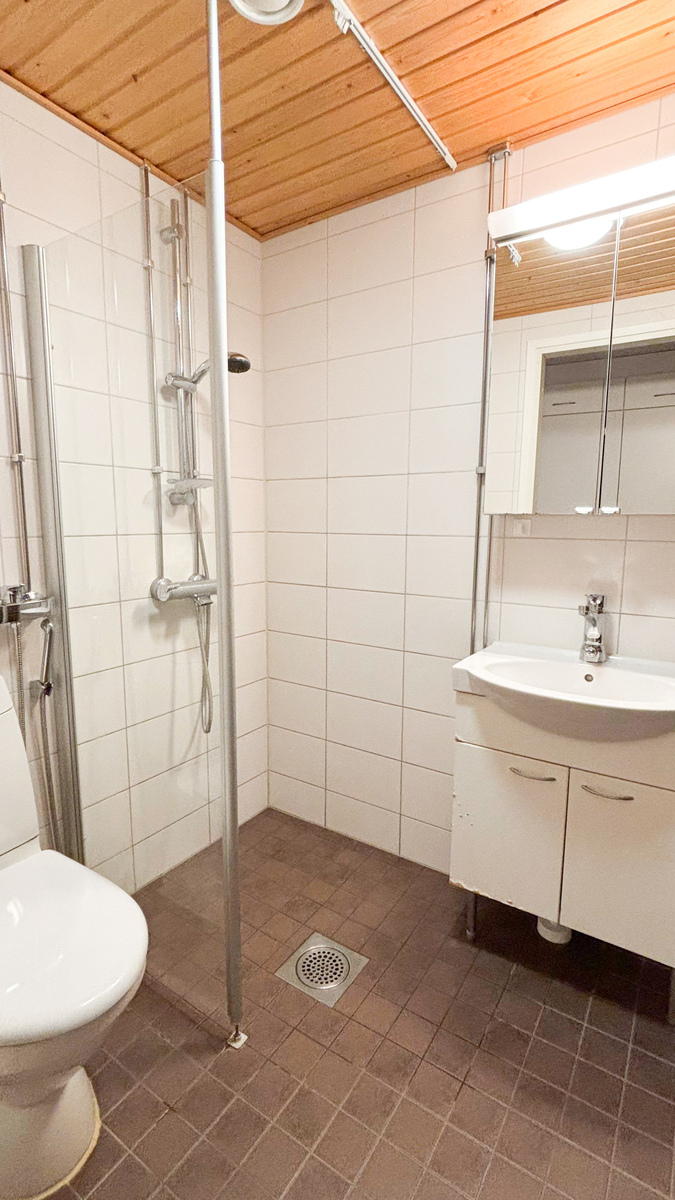 Tilavaan kylpyhuoneeseen mahtuu oma pesukone. Vuokranantaja uusii käsienpesualtaan ja allaskaapiston.