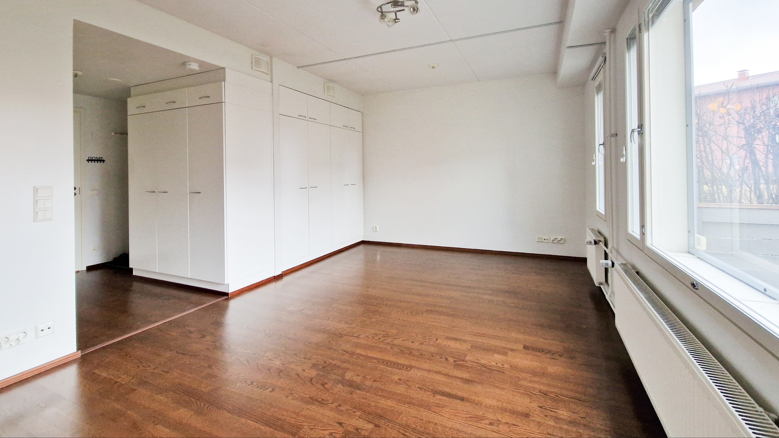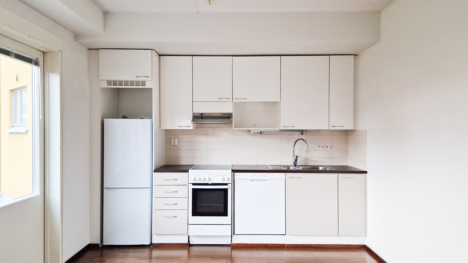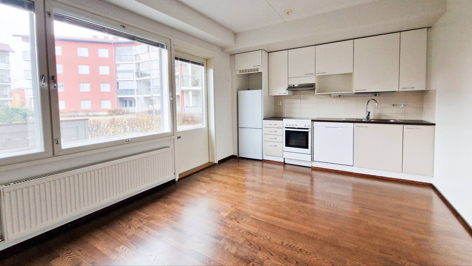 Tämä koti on avara ja valoisa, keittiössä on kaikki tarpeellinen pientä kokkailua varten ja tilaa on myös ruokapöydälle. Alkoviin saa sängyn piiloon verhon taakse halutessaan.