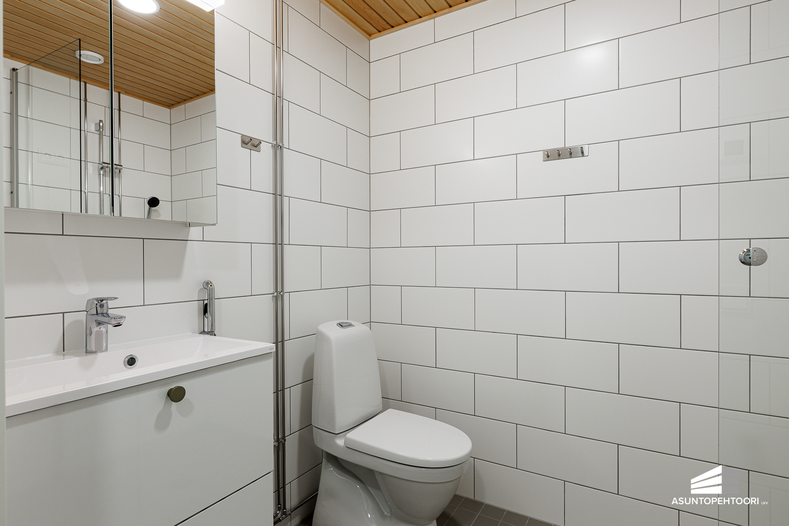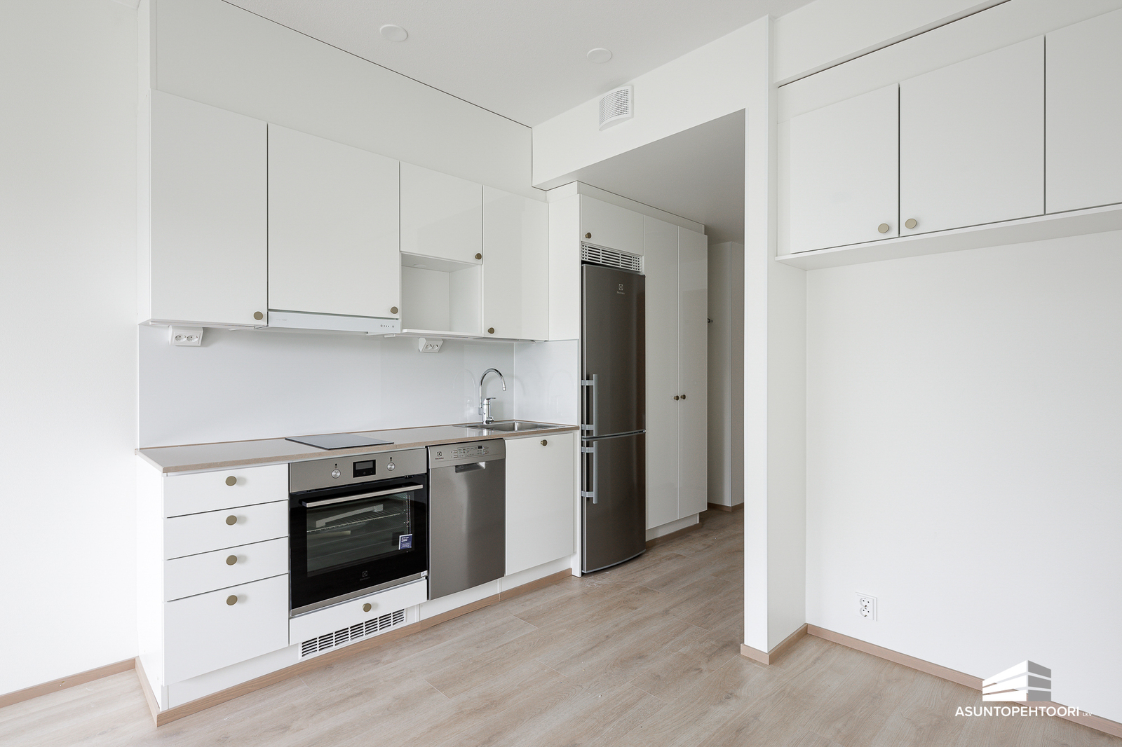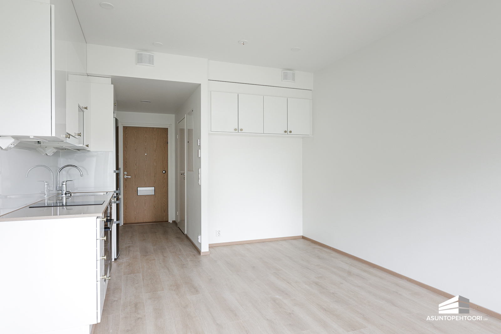 Tässä yksiössä tammensävyinen laminaatti ja valkoiset seinäpinnat sekä moderni keittiö laadukkailla materiaaleilla – kaunis kvartsikomposiittitaso sekä kiiltäväpintaiset valkoiset kaapistot ja Electroluxin kodinkoneet. Varustukseen kuuluu mm. jääkaappipakastin, induktioliesi sekä astianpesukone. Moderni teema jatkuu kylpyhuoneessa, joten myös sieltä löytyvät vaaleat ja tyylikkäät pinnat sekä kiintokalusteet. Tilassa on lasinen suihkuseinä ja paikka täysleveälle pyykinpesukoneelle. Tilan tuntua tuovat suuret ikkunat ja kesäisin ilahduttava ranskalainen parveke.