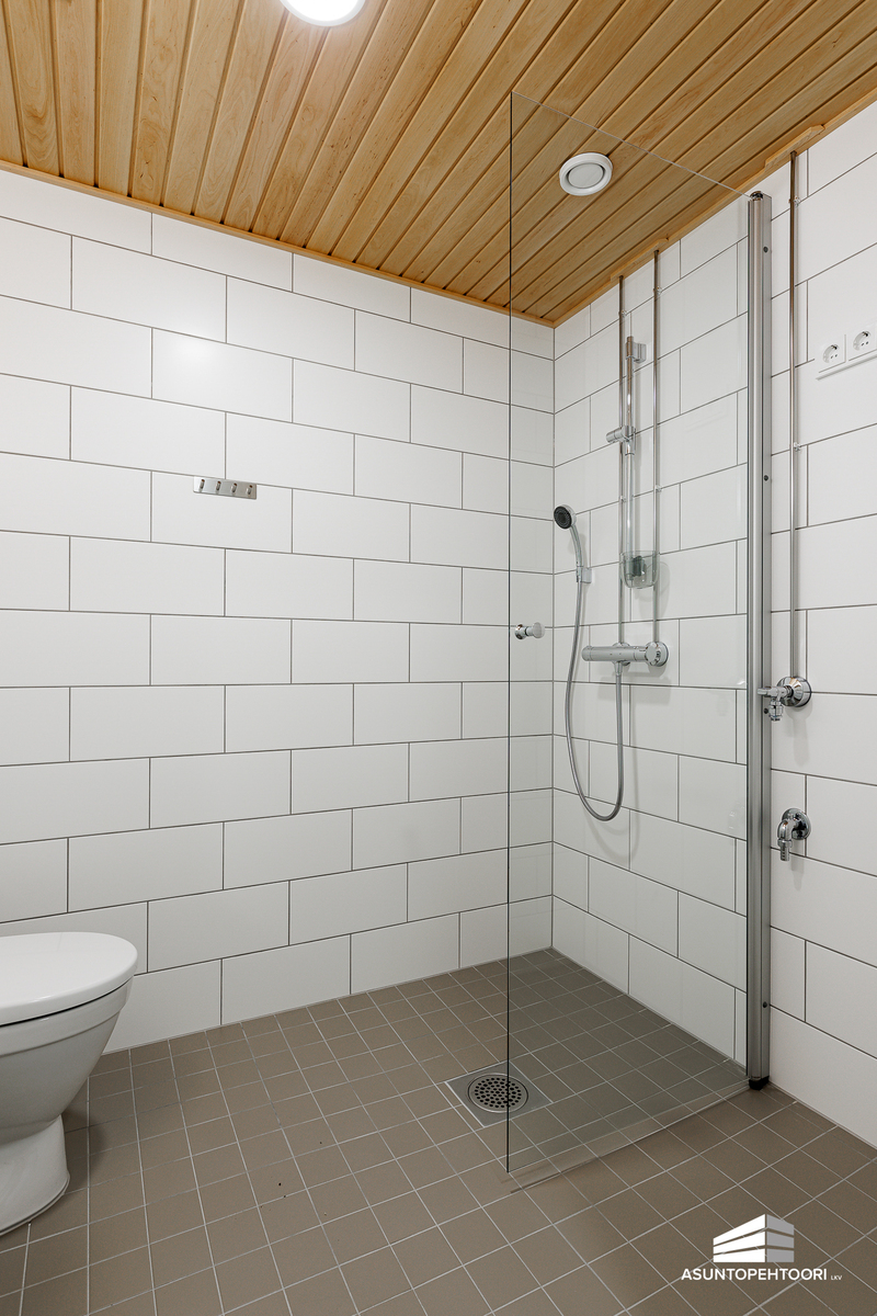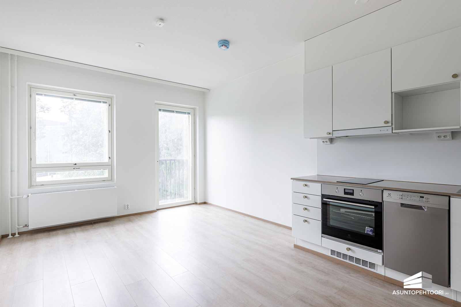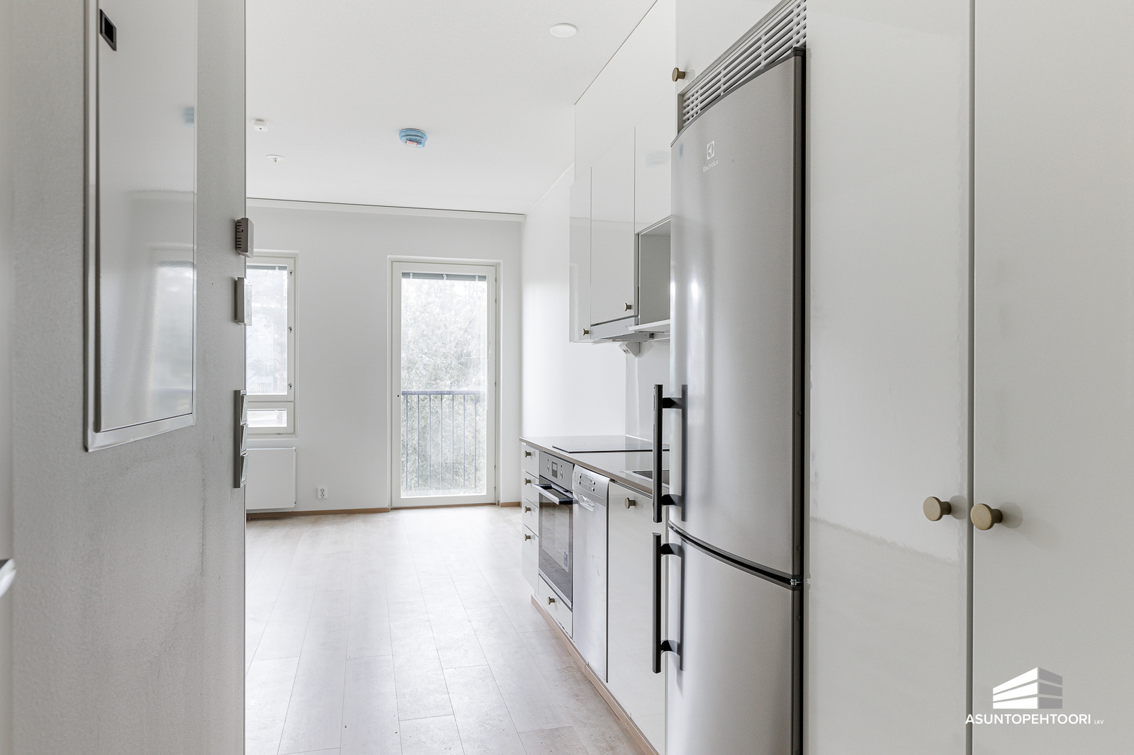 Tässä yksiössä tammensävyinen laminaatti ja valkoiset seinäpinnat sekä moderni keittiö laadukkailla materiaaleilla – kaunis kvartsikomposiittitaso sekä kiiltäväpintaiset valkoiset kaapistot ja Electroluxin kodinkoneet. Varustukseen kuuluu mm. jääkaappipakastin, induktioliesi sekä astianpesukone. Moderni teema jatkuu kylpyhuoneessa, joten myös sieltä löytyvät vaaleat ja tyylikkäät pinnat sekä kiintokalusteet. Tilassa on lasinen suihkuseinä ja paikka täysleveälle pyykinpesukoneelle. Tilan tuntua tuovat suuret ikkunat ja kesäisin ilahduttava ranskalainen parveke.