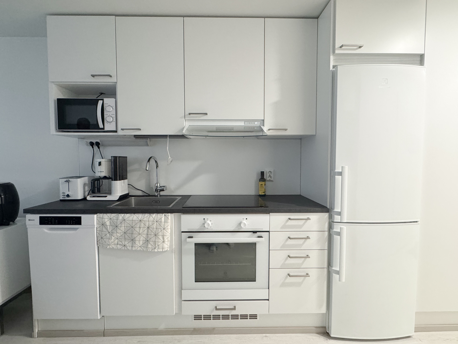 Tässä asunnossa on tilava ja helposti kalustettava pohjaratkaisu. Modernissa keittiössä on kaikki tarpeellinen sujuvaan arkeen mm. astianpesukone. Kauniisti laatoitetussa kylpyhuoneessa on tilavaraus pyykinpesukoneelle kätevän oven takana. Säilytystilaa on mukavasti huoneiston kaapistoissa ja kesäisin ilahduttaa ranskalainen parveke.