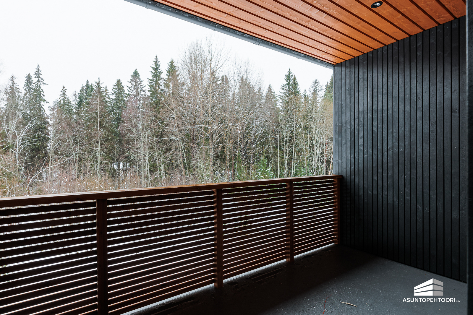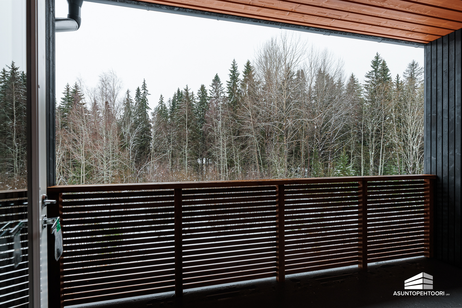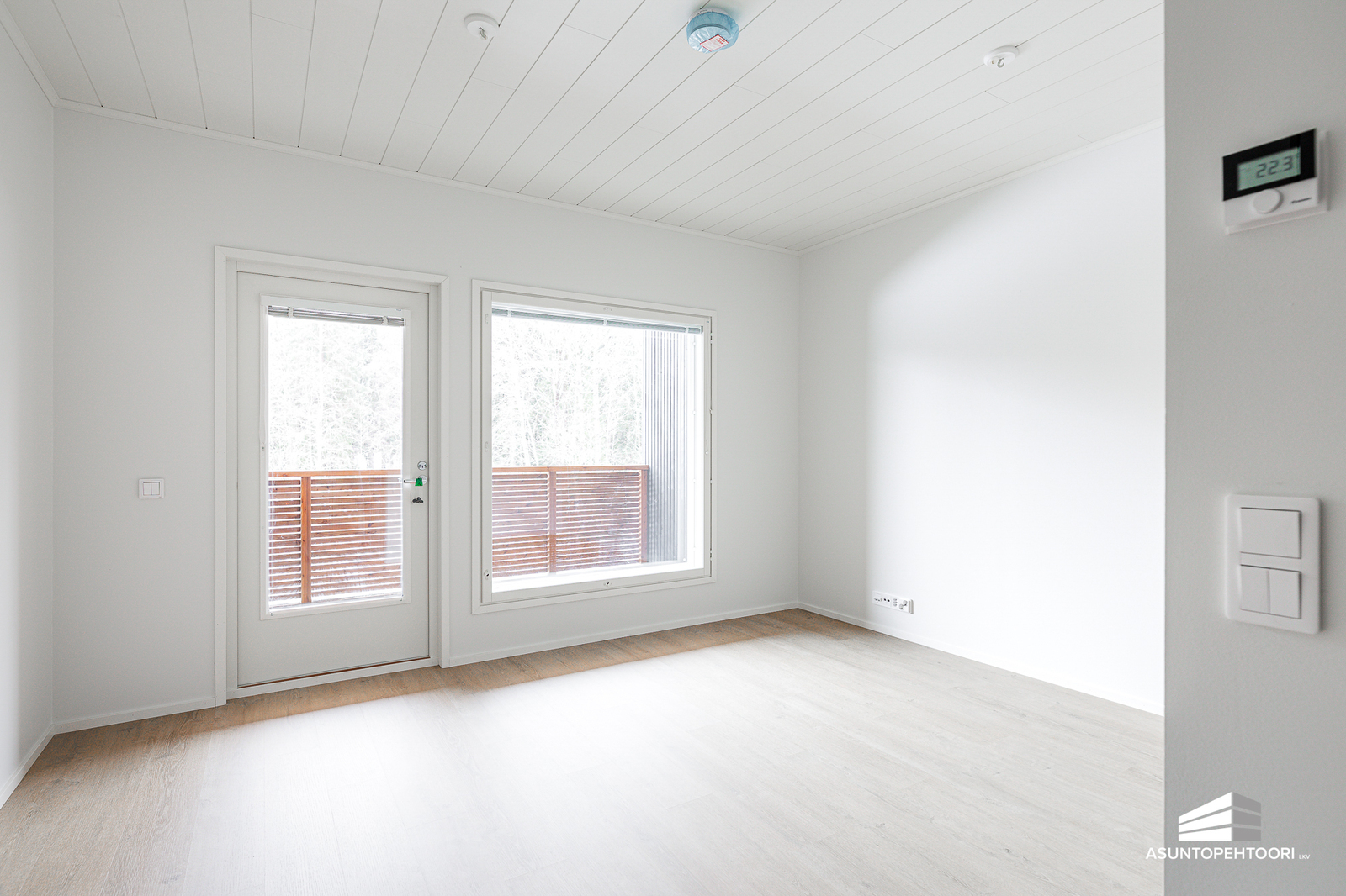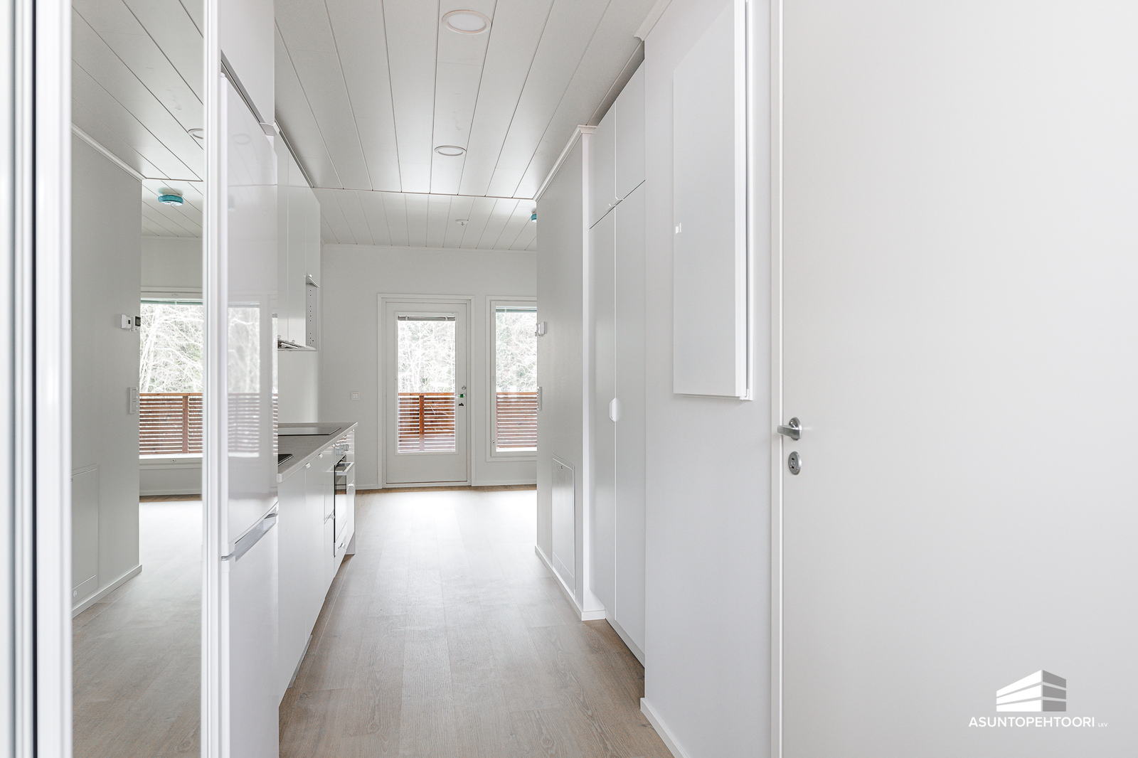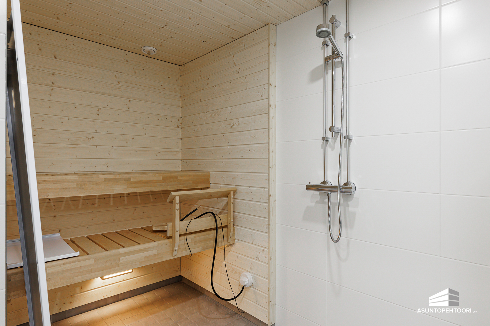 Tämän korkeatasoisen asunnot lattiat ovat jalalle mukavaa vinyylilankkua ja seinät on maalattu raikkaan vaaleiksi, joten asunto taipuu monen sisustajan makuun. Modernin, täysin koneistetun keittiön varusteluun kuuluu jääkaappi/pakastin, liesituuletin, induktioliesitaso, erillisuuni ja integroitu astianpesukone. Tyylikkäästi laatoitetussa kylpyhuoneessa on tilavaraus pyykinpesukoneelle. Arkeen ripauksen luksusta tuo isolla lasiseinällä varustettu oma sauna ja viihtyisä terassi.