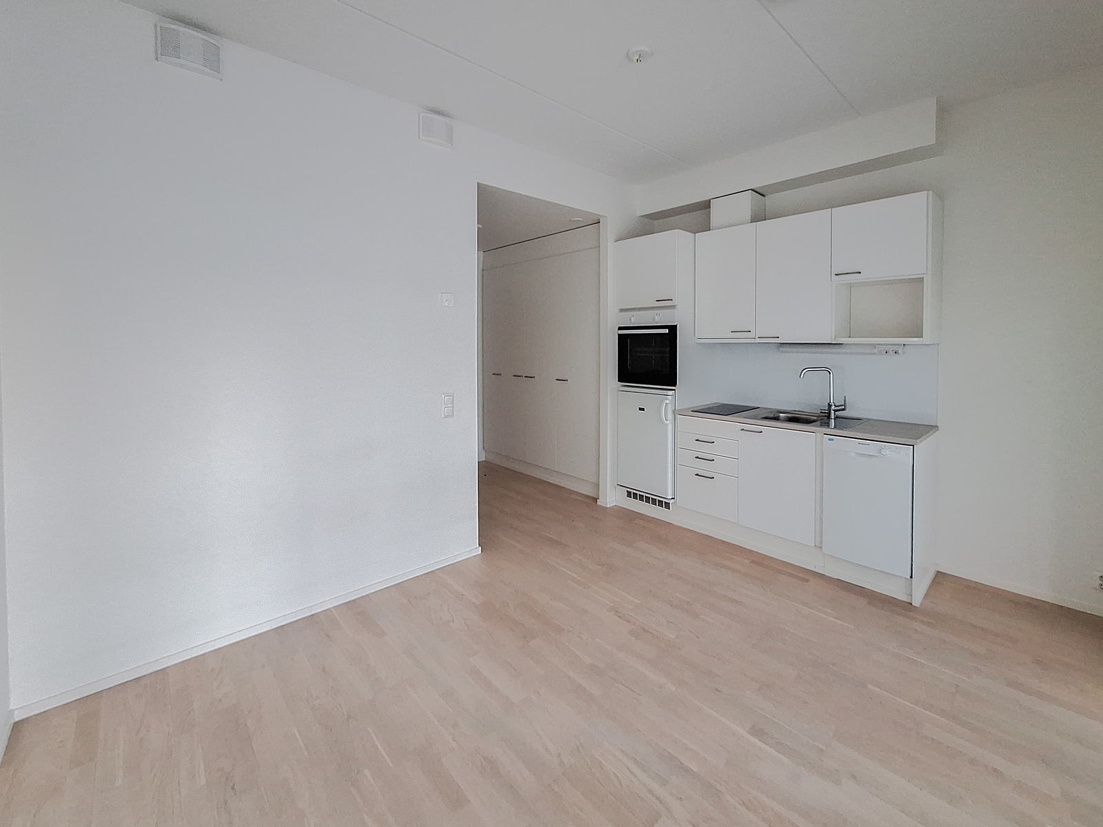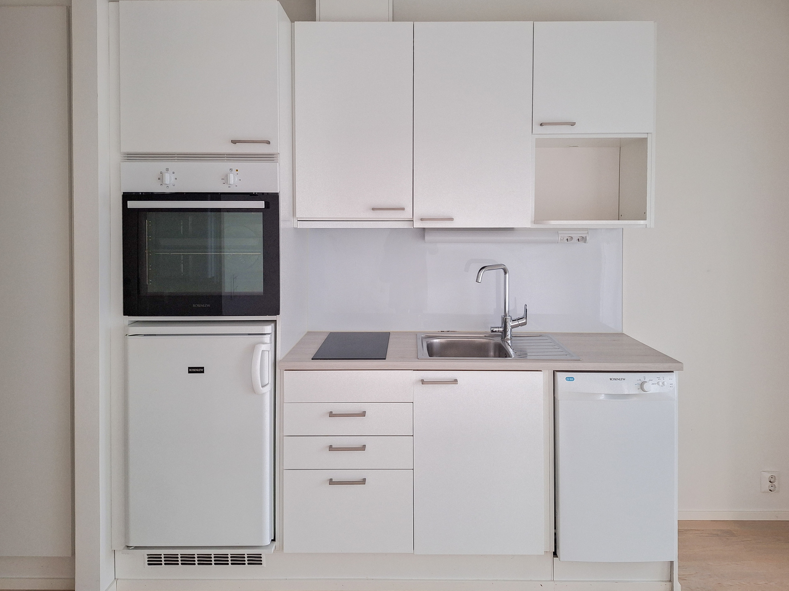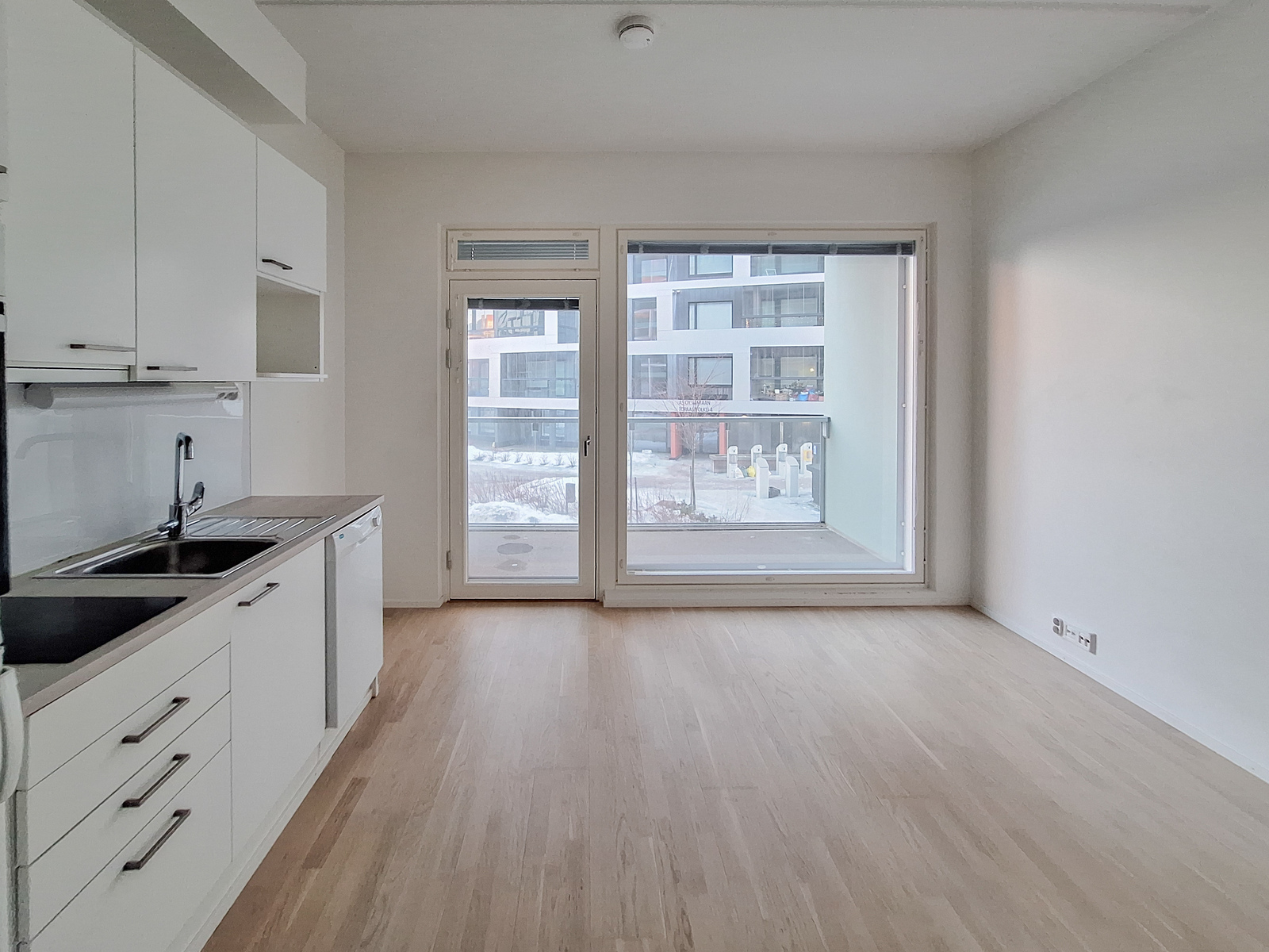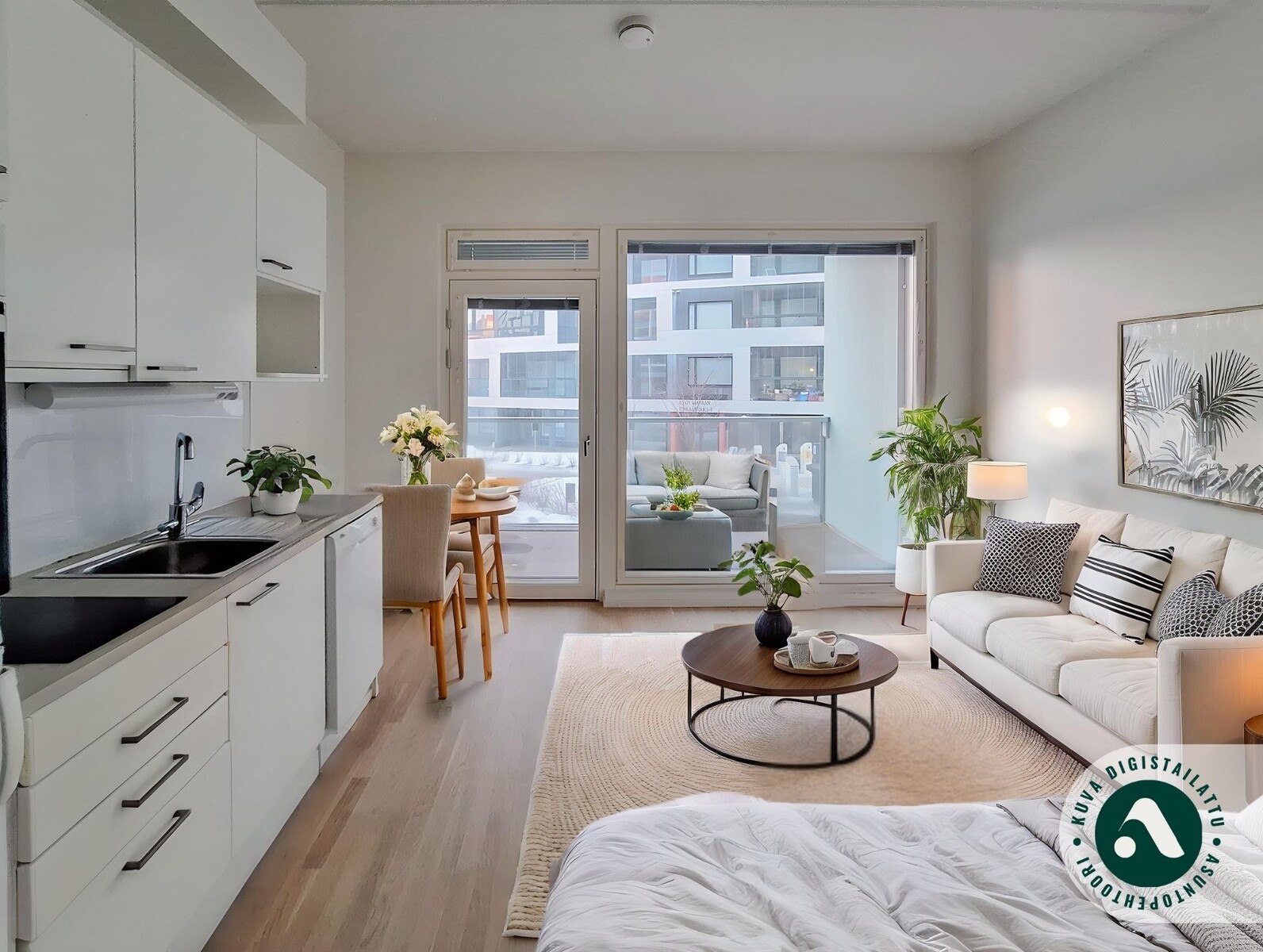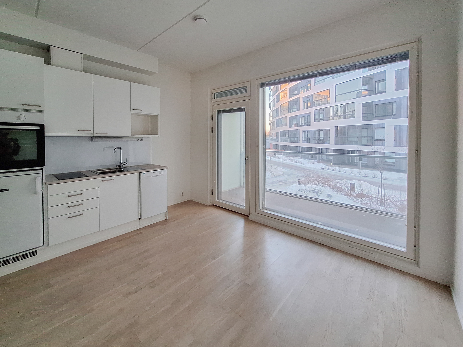 Tämä kompakti koti toimivalla pohjaratkaisulla tarjoaa loistavat puitteet viihtyisään asumiseen! Tavallista korkeampi huonekorkeus ja suuret ikkunat tekevät kodistasi erityisen valoisan ja avaran. Mukava vesikiertoinen lattialämmitys helpottaa sisustamista kun pattereita ei ole seinillä tilaa viemässä. Asunnon seinät ovat raikkaan valkoiset ja lattiat ylellistä parkettia. Modernista keittiöstä löytyy kaikki tarvittava kotikokin tarpeisiin astianpesukoneineen ja keraamisine liesitasoineen. Tyylikkäästi laatoitetussa kylpyhuoneessa on peilikaappi, kääntyvä suihkuseinä ja pesukoneliitäntä. Asunnon helmi on koko asunnon levyinen parveke, josta näkymät sisäpihan puolelle.