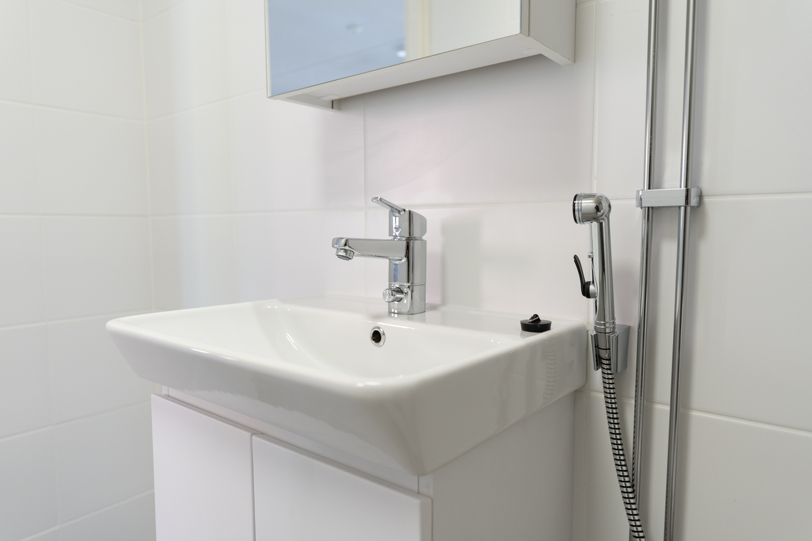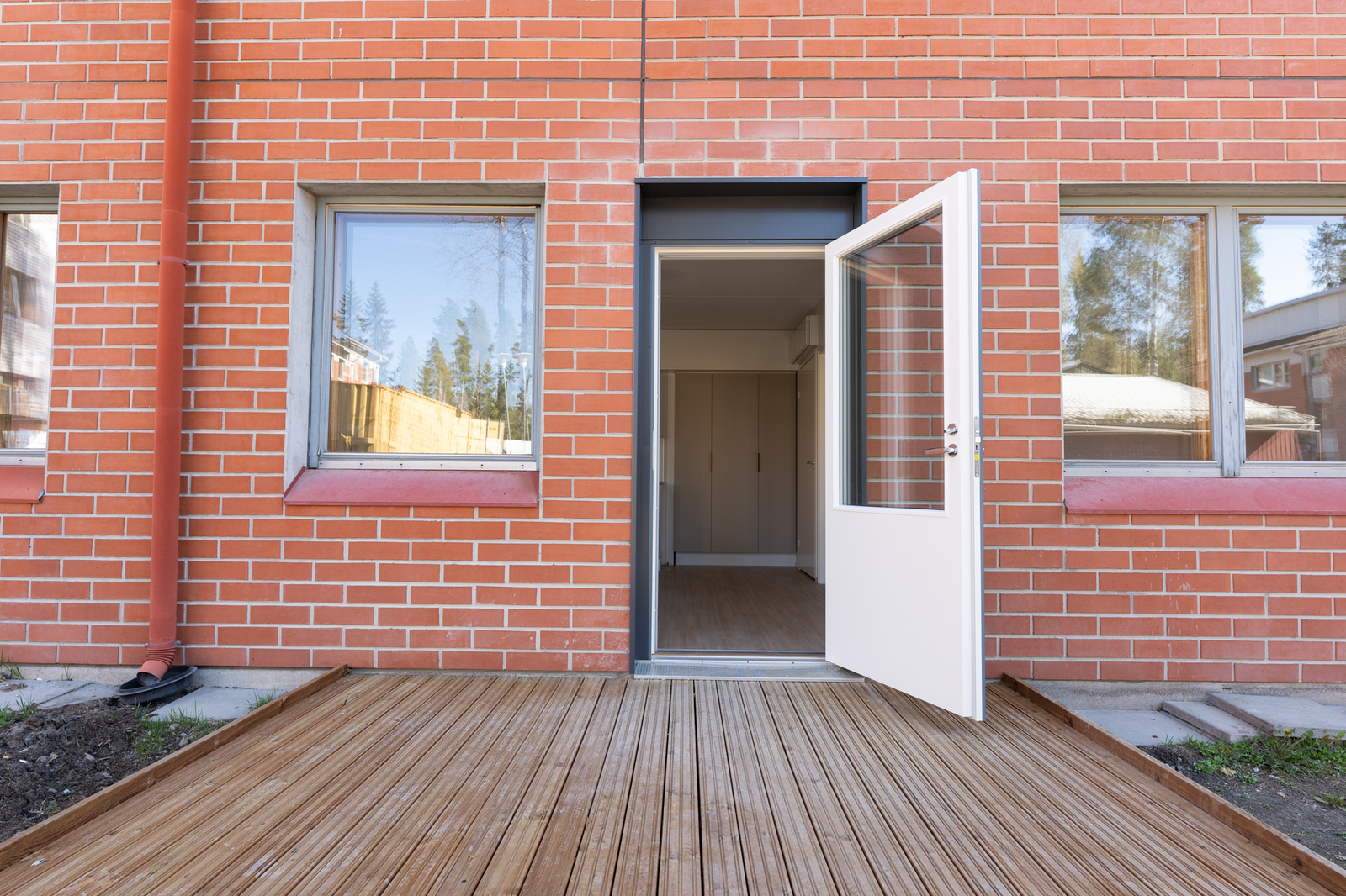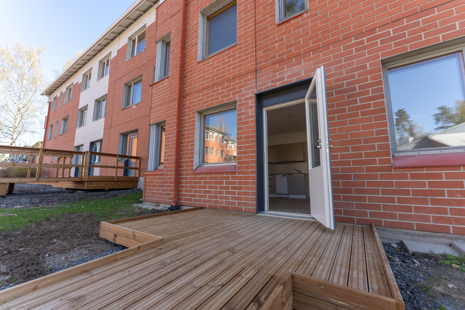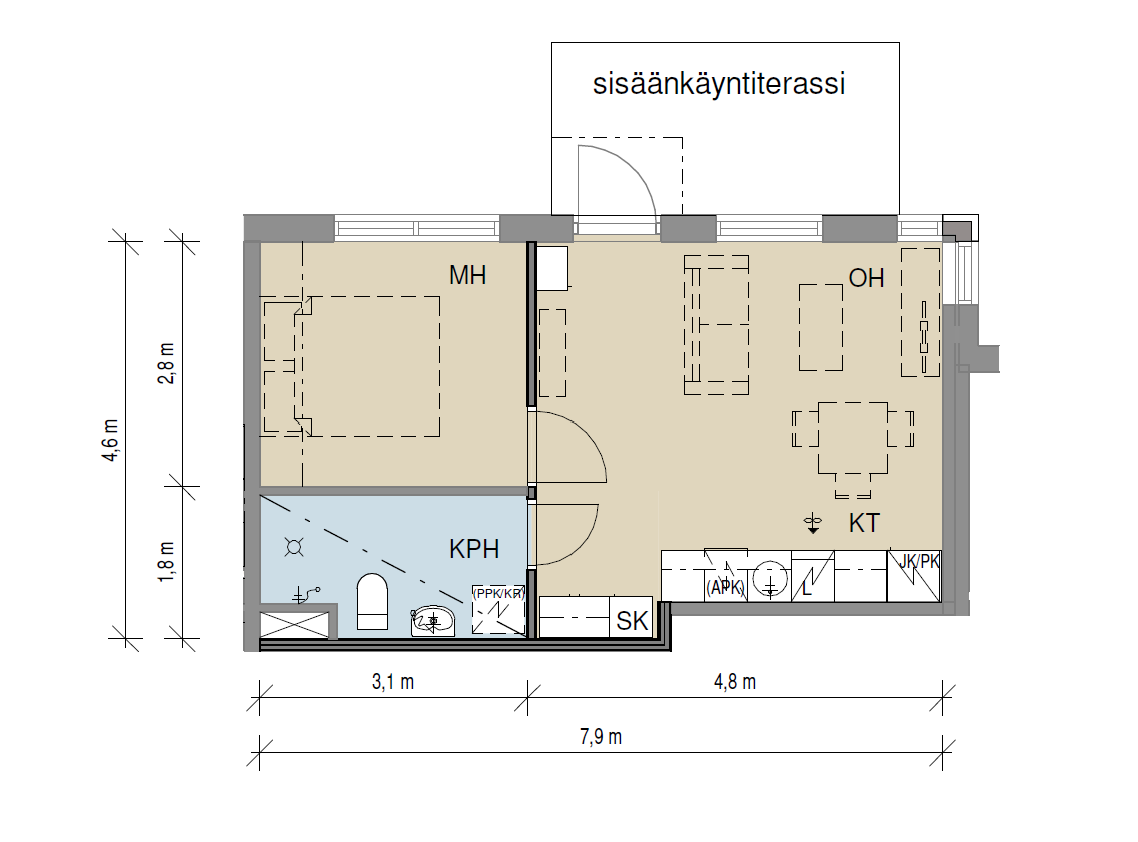 Tämä omalla pienellä terassilla varustettu asunto on avara ja kaunis. Lattiat ovat vaaleaa laminaattia ja seinät maalattu valkoisella. Asunto sopii pohjaratkaisunsa puolesta erityisen hyvin yksin asuvalle tai pariskunnalle. Keittiö on lähes uutta vastaava ja kalusteisiin kuuluu sähköliesi/uuni, jääkaappipakastin, liesituuletin ja astianpesukone. Kokonaan laatoitetussa siistissä kylpyhuoneessa on peilikaappi ja liitäntä pyykinpesukoneelle.