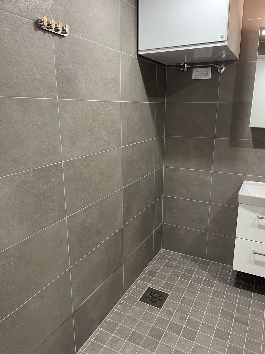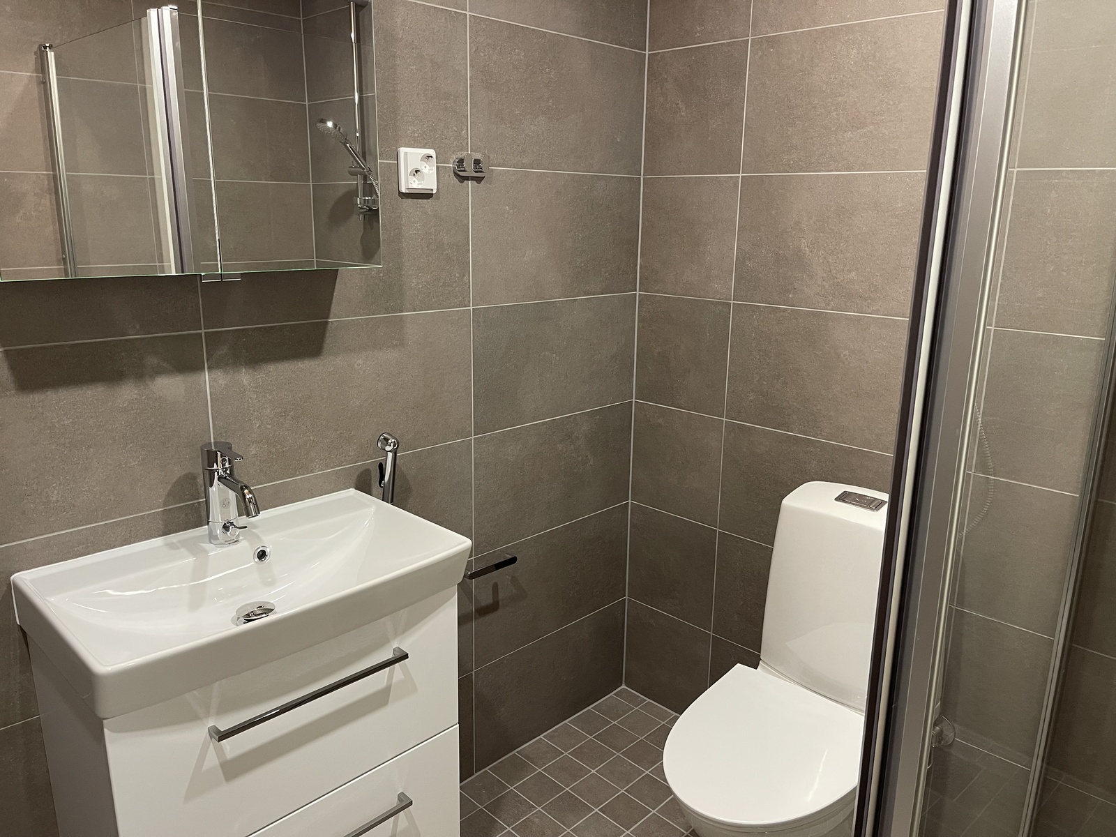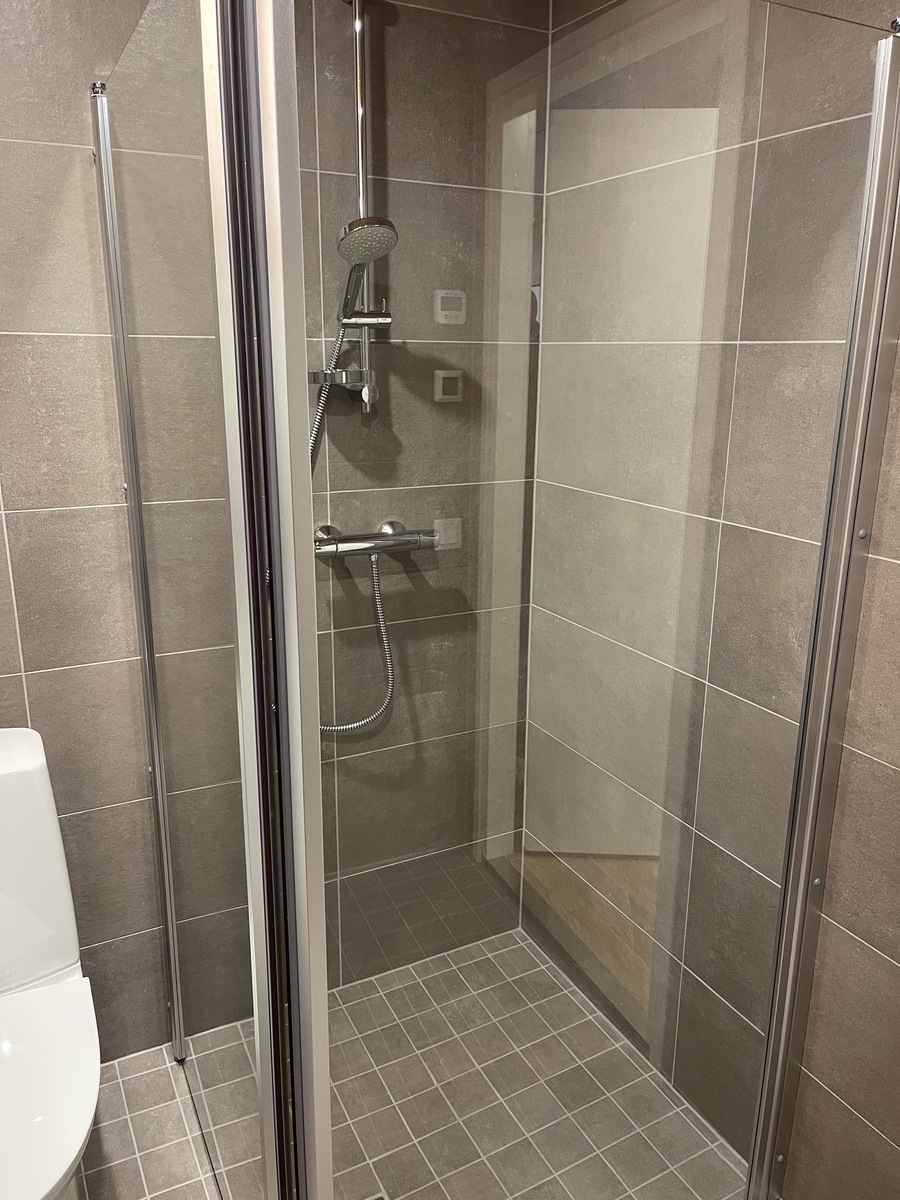 Tilava kylpyhuone on kauttaaltaan laatoitettu, varustettu lattialämmityksellä ja pyykkitornivarauksella. Säilytystilaa löytyy reippaasti eteisen peililiukuovikaapistoista.