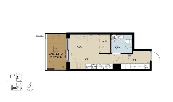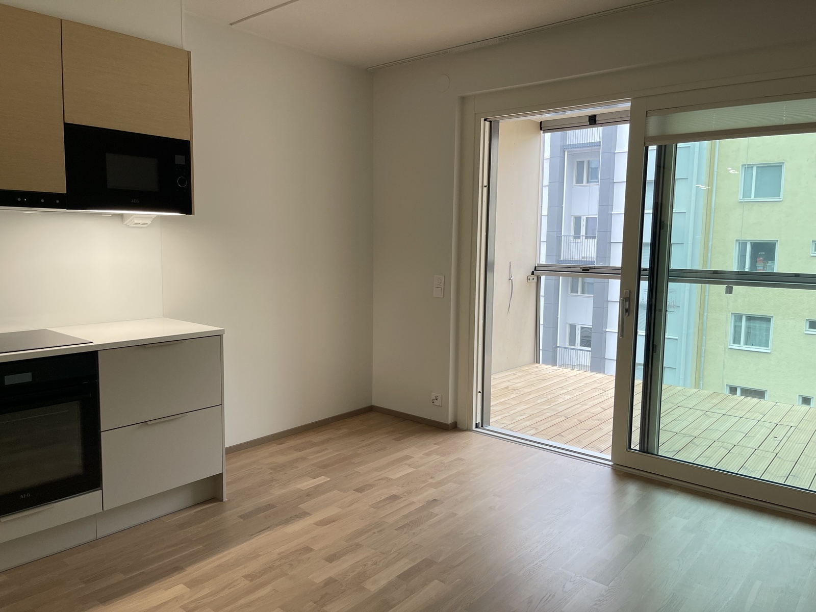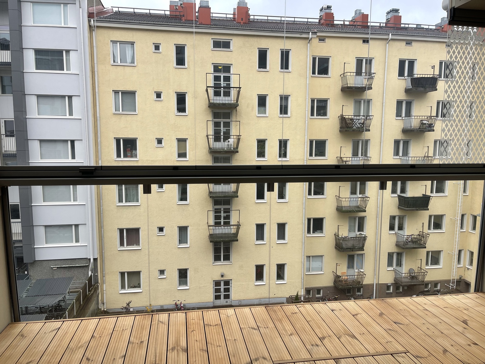 Olohuoneesta avautuu iso lasitettu parveke, joka toimii lisähuoneena aina aikaisesta keväästä pitkälle syksyyn. Nauti aamukahvit tai rentoudu ilta-auringossa kaupungin sykkiessä ympärilläsi.