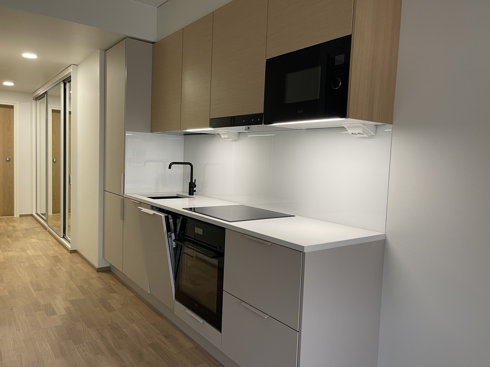 Tyylikkäässä, täysin koneistetussa avokeittiössä AEG:n integroidut kodinkoneet tekevät arjesta sujuvaa – ruoanlaitto sujuu kuin itsestään, ja tilaa jää reilusti myös ruokailuryhmälle.