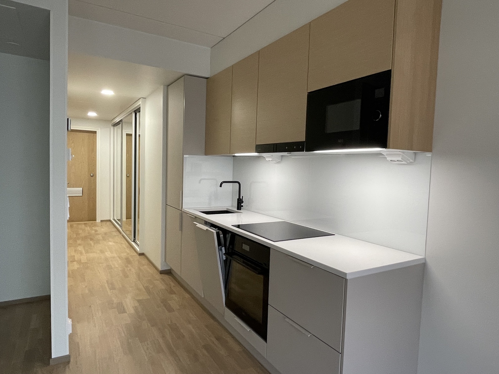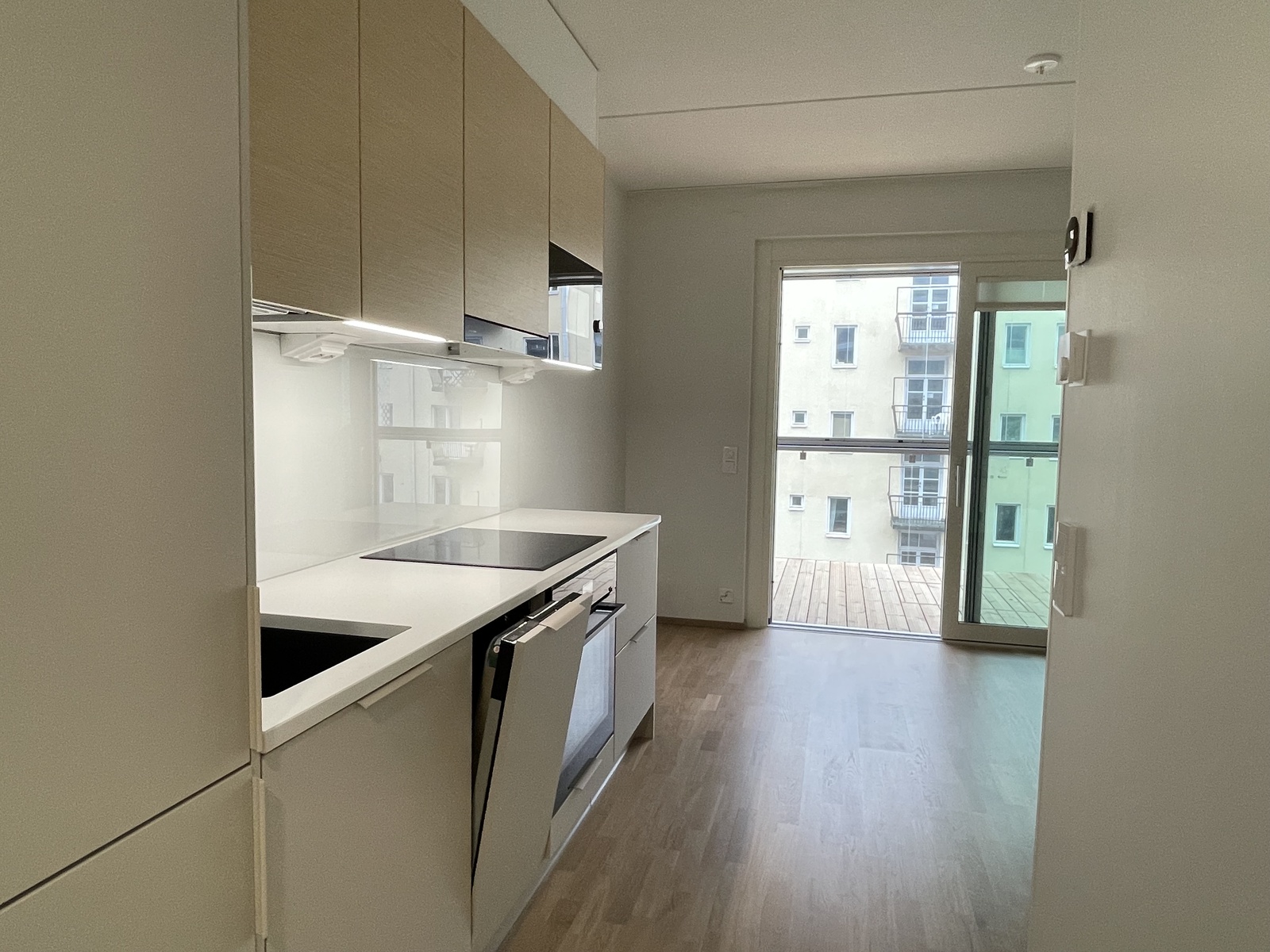 Tässä älykkäästi suunnitellussa asunnossa jokainen neliö on hyödynnetty tarkkaan. Vesikiertoinen lattialämmitys huolehtii tasaisesta lämmöstä ja vapauttaa seinäpinnat sisustukselle.