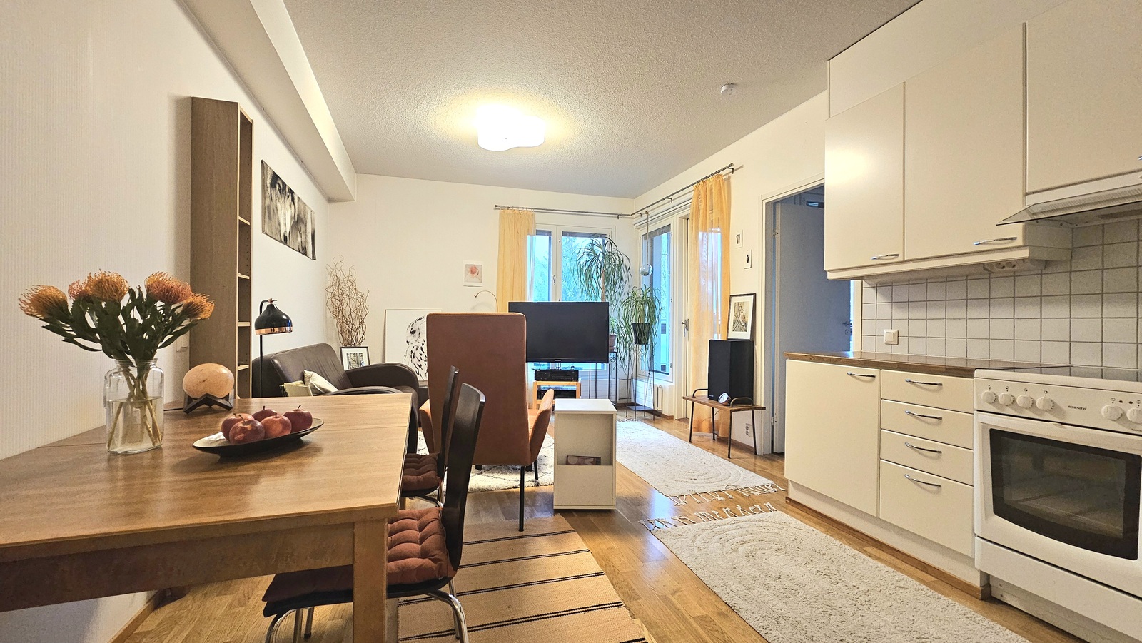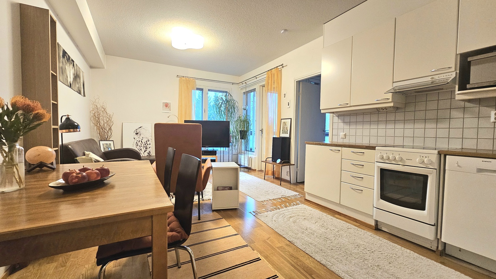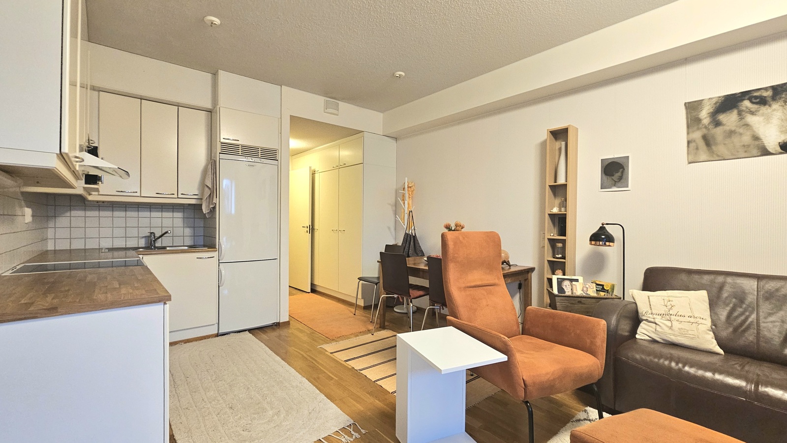 Asunnossa on tilava olohuone, joka yhdistyy avokeittiöön, luoden avaran ja toimivan oleskelutilan. Makuuhuoneessa on runsaasti tilaa sekä liukuovikaapit, jotka tarjoavat erinomaiset säilytysratkaisut.