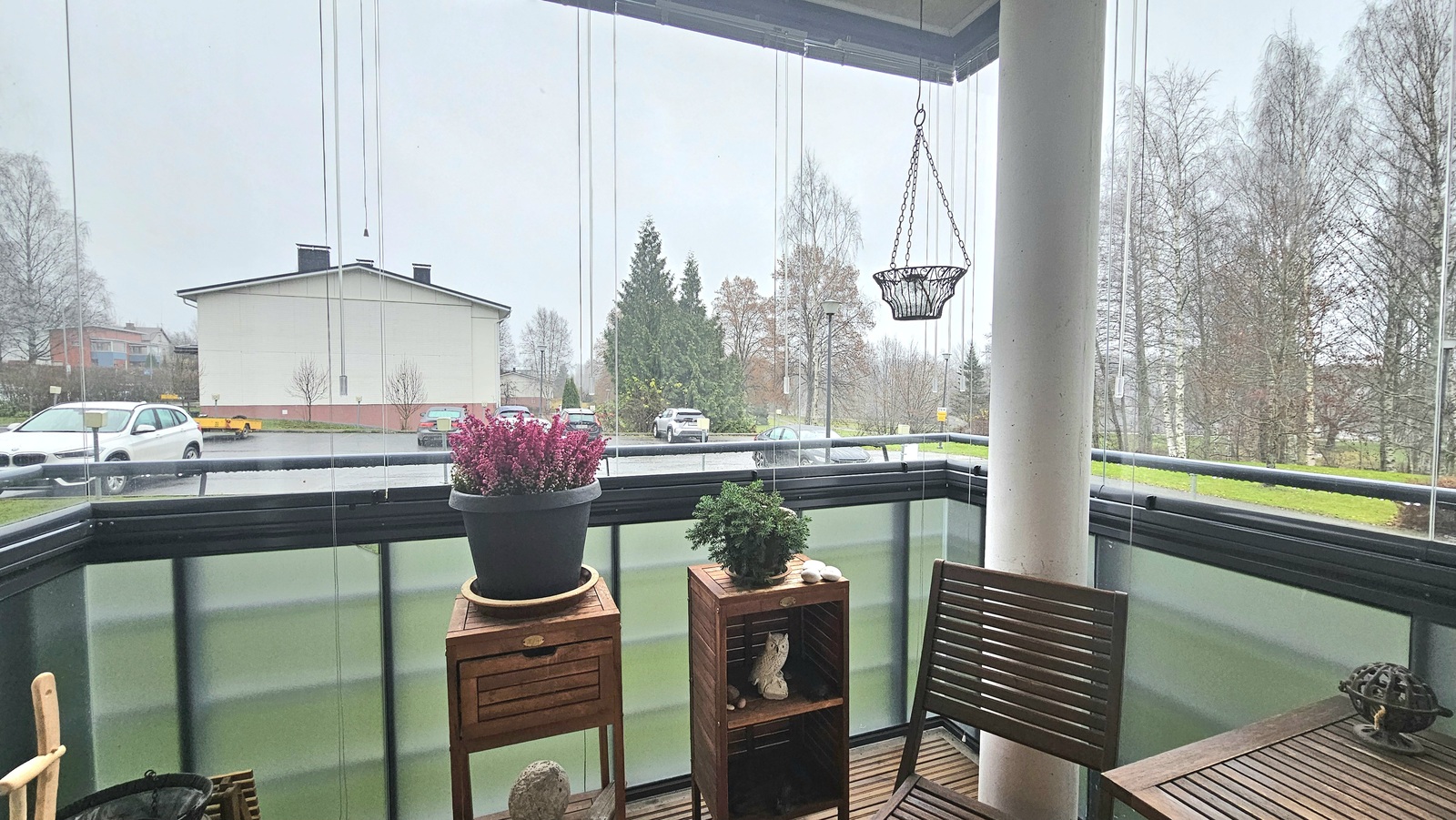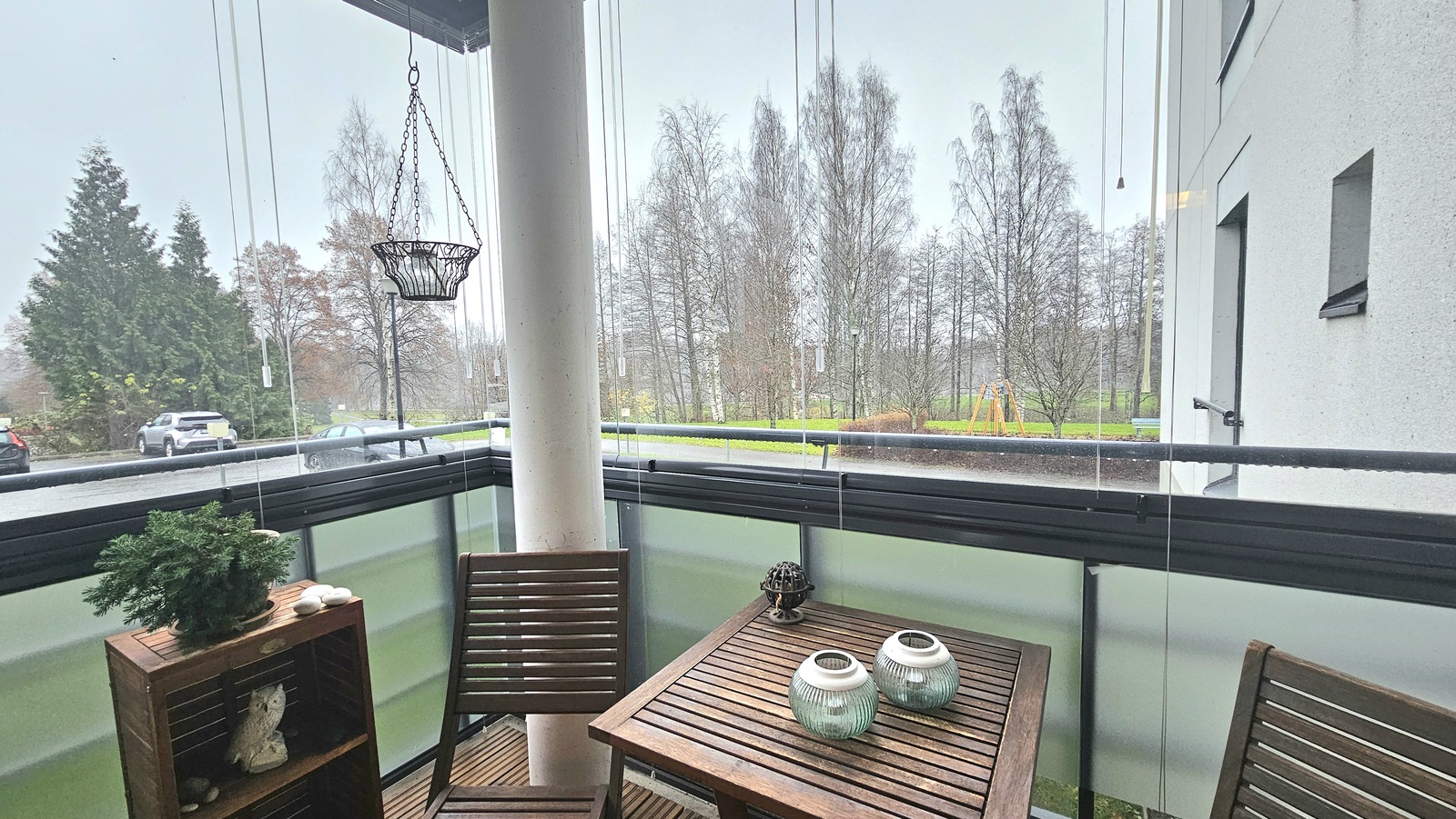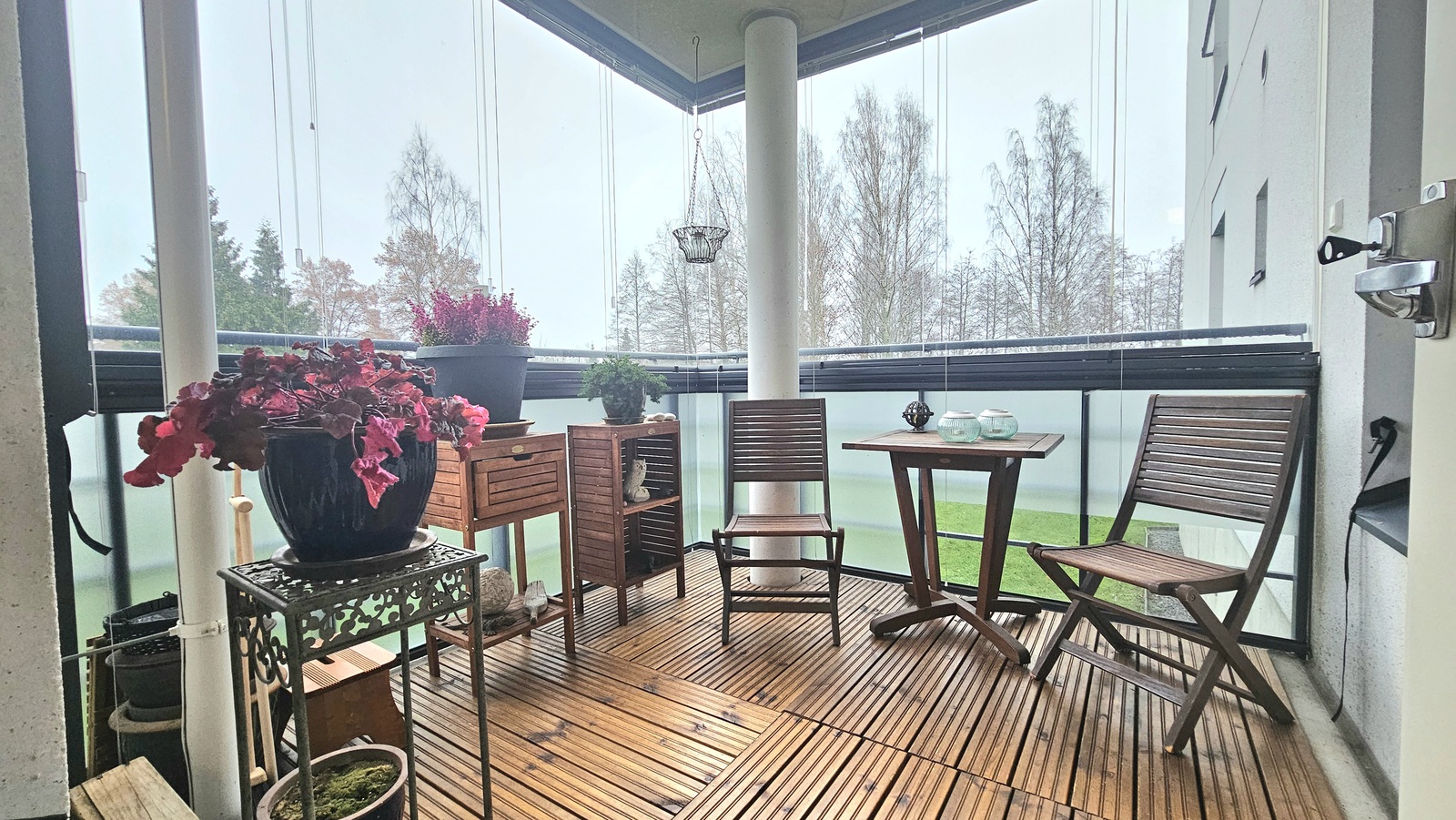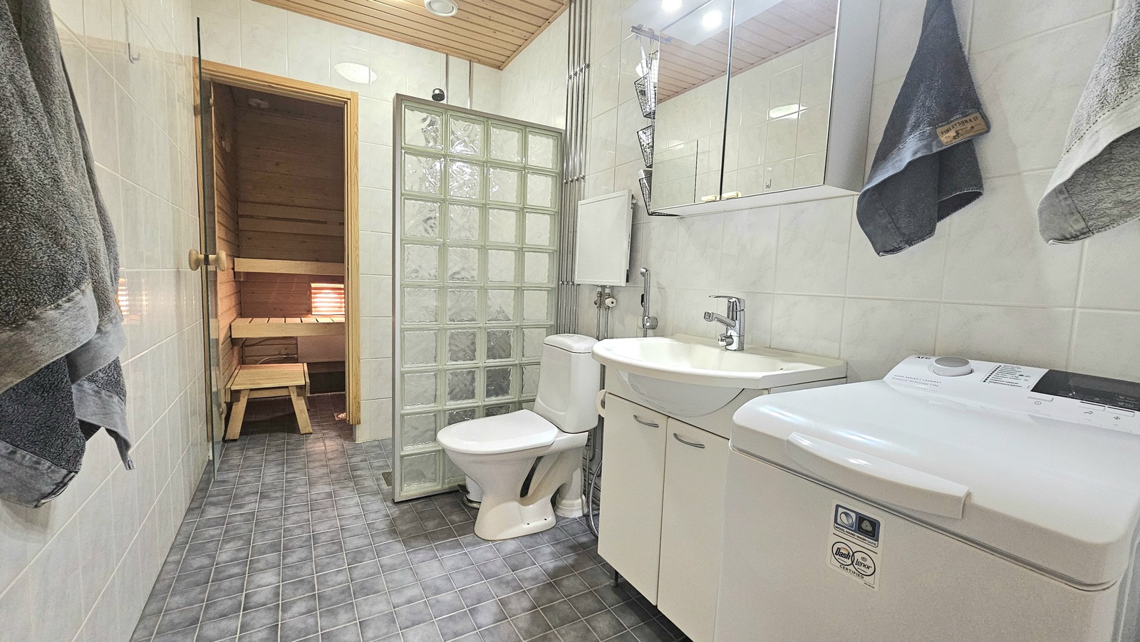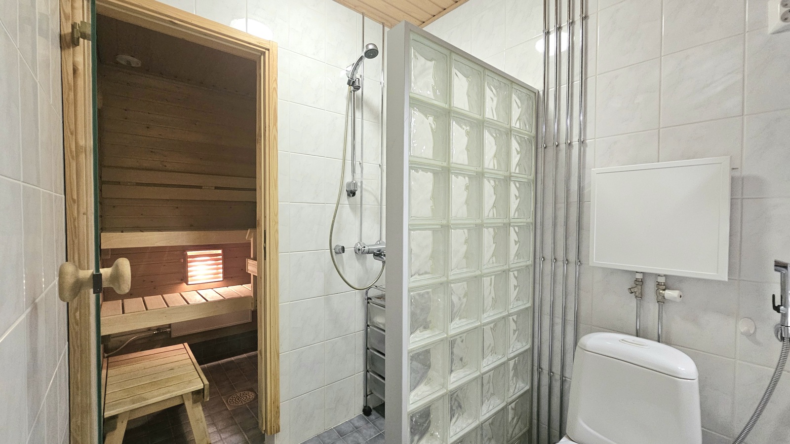 Kylpyhuone on reilun kokoinen – sinne mahtuu hyvin pesukone sekä kodinhoitotarvikkeet. Tilassa on myös wc, suihku ja oma sauna, jotka tekevät arjesta mukavaa. Lisäksi asunnossa on lasitettu parveke, jossa voi nauttia rauhassa vuodenajasta riippumatta.