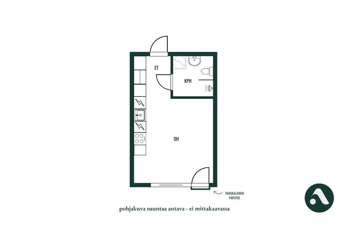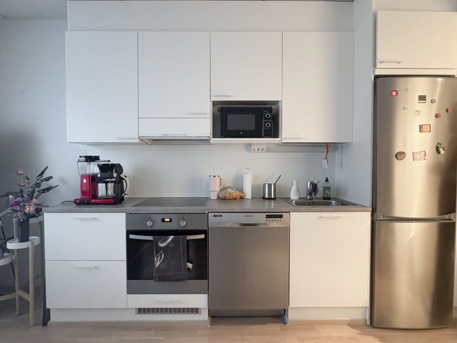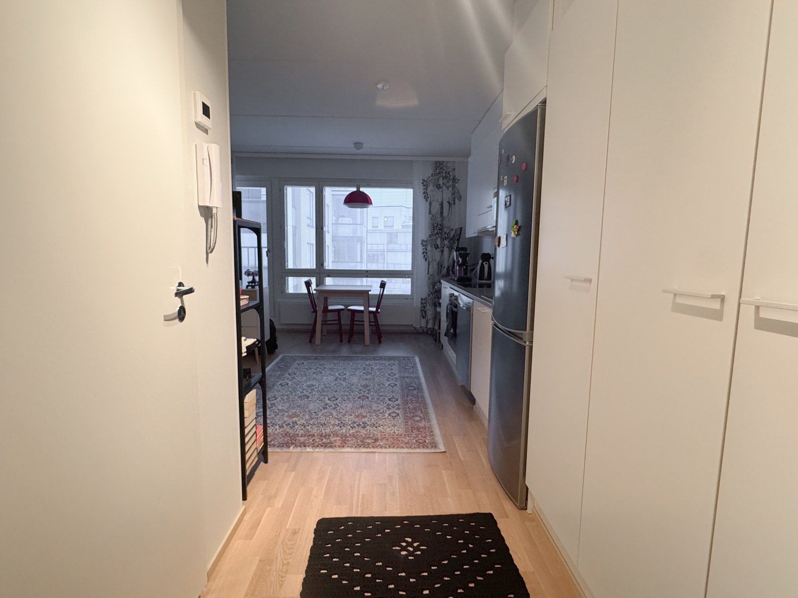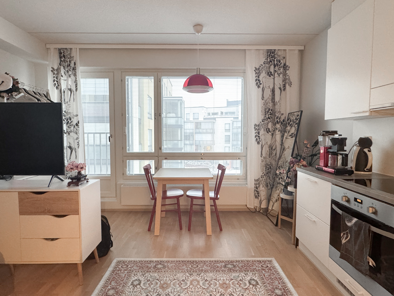 Asunnossa on tehokas ja helposti kalustettava pohjaratkaisu. Modernista keittiöstä löytyy kaikki tarpeellinen sujuvaan arkeen kuten jääkaappi/pakastin ja astianpesukone sekä laatoitetussa kylpyhuoneessa on liitäntä pyykinpesukoneelle. Kesäisin ilahduttaa asunnon ranskalainen parveke. Vuokraan sisältyy DNA:n 100 M nettiyhteys.