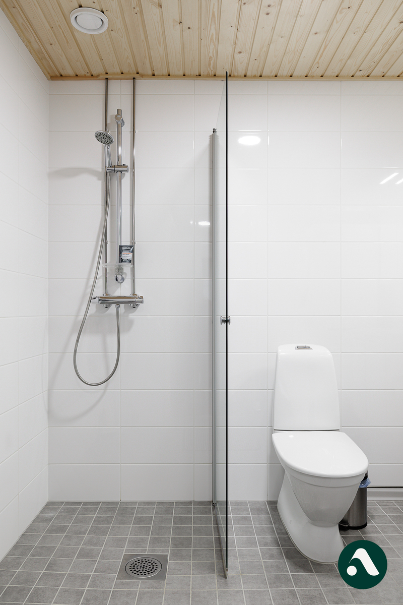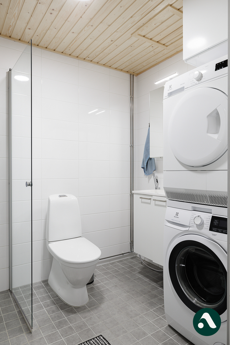 Säilytystilaa löytyy lisäksi eteisen vaatekaapeista sekä asunnolle kuuluvasta irtaimistovarastosta. Kylpyhuone on moderni ja sävymaailma harmooninen.