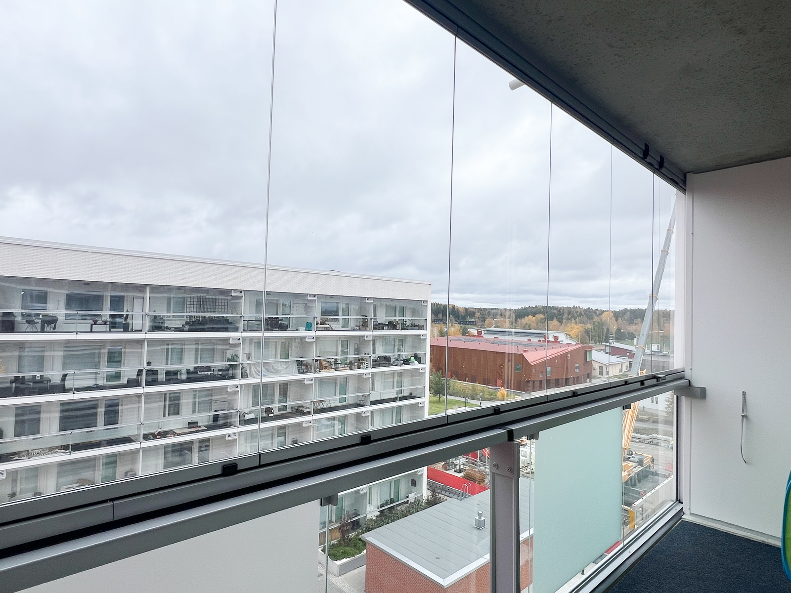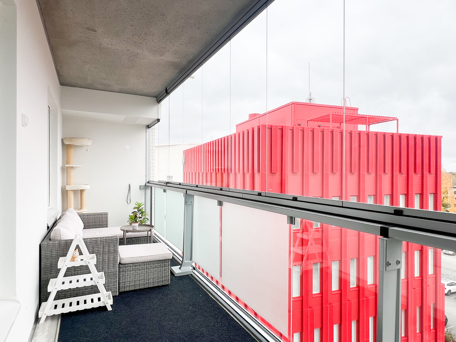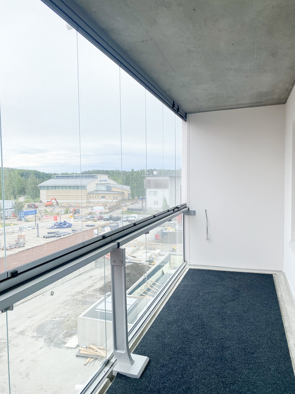 Koko asunnon levyinen lasitettu parveke toimii upeana lisätilana – olipa kyse aamukahvista auringossa tai illanvietosta ystävien kanssa.