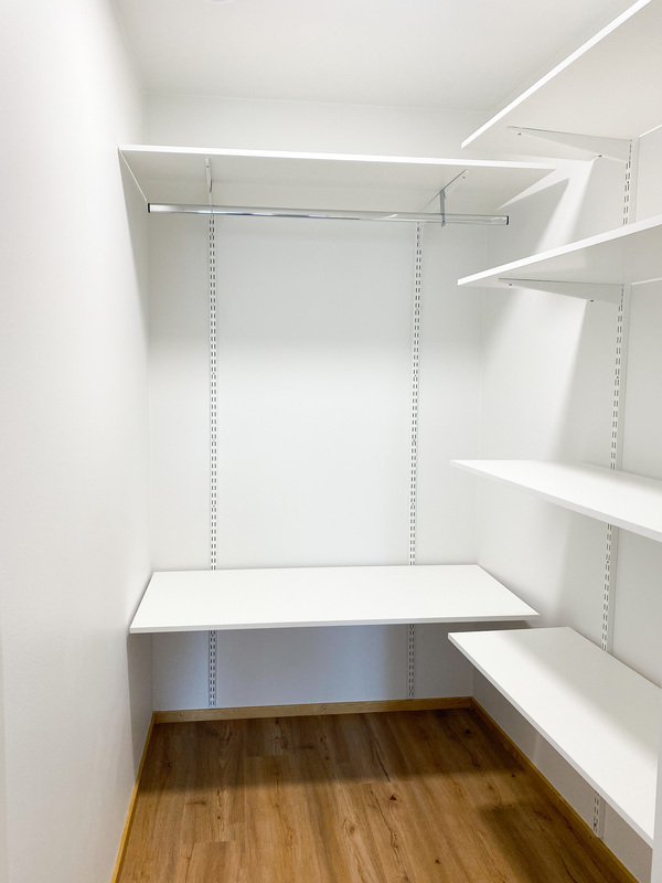 Makuuhuoneessa ei ole perinteisiä kaapistoja, vaan iso vaatehuone, joka tarjoaa reilusti säilytystilaa ja pitää makuutilan selkeänä ja rauhallisena.