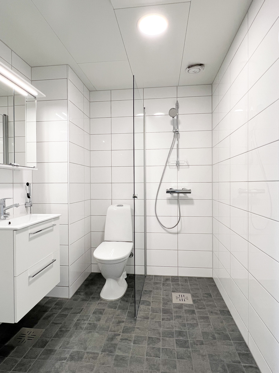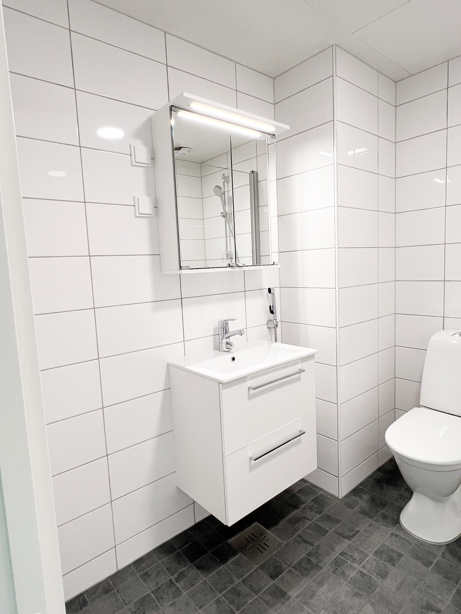 Makuuhuoneeseen mahtuu hyvin parisänky ja toisella seinustalla on tilavat vaatekaapit. Säilytystilaa löytyy lisäksi eteisen kaapistosta sekä asunnolle kuuluvasta irtaimistovarastosta. Oleskelutilojen ja makuuhuoneiden lattiat ovat kestävää ja jalalle mukavaa vinyyliä. Kylpyhuone on moderni ja siellä on paikka pesutornille.