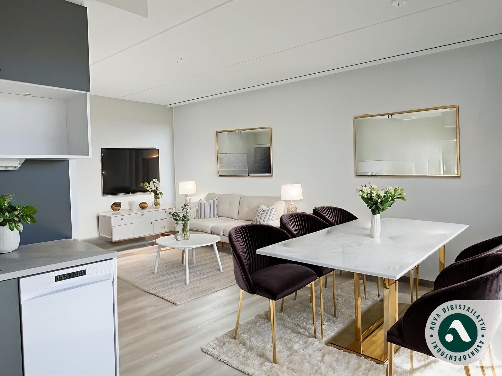 Tässä asunnossa on erinomainen pohjaratkaisu ja kalustaminen on helppoa. Olohuone ja keittiö ovat yhtenäistä avaraa tilaa, mutta keittiö jää käytännöllisesti omaan nurkkaukseensa. Keittiön kaapistot ovat tyylikkään harmaan väriset ja varustukseen kuuluu jääkaappipakastin, keraaminen liesi, liesituuletin sekä astianpesukone. Oleskelutilasta on kulku isolle, koko asunnon levyiselle lasitetulle parvekkeelle.