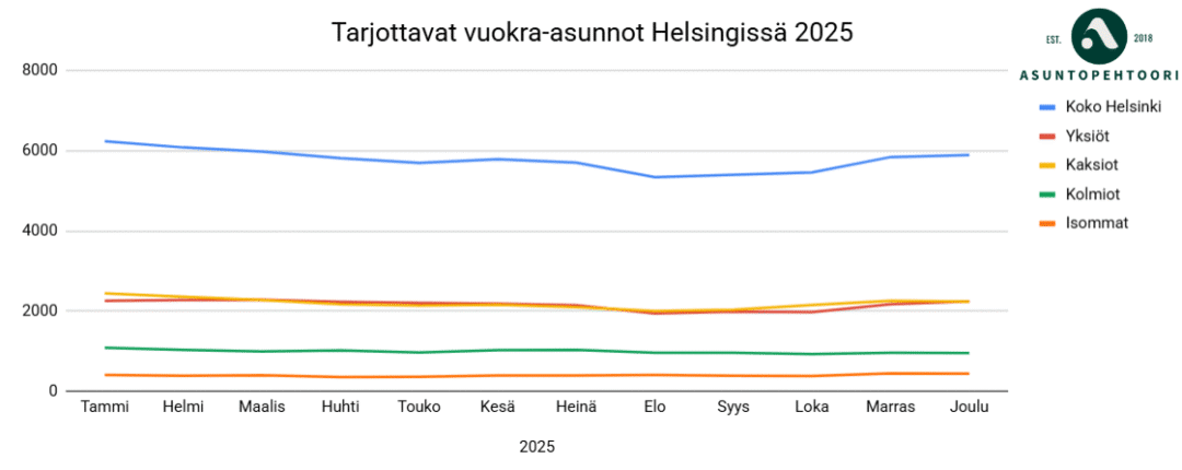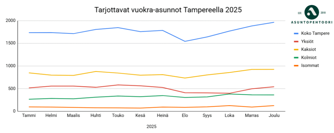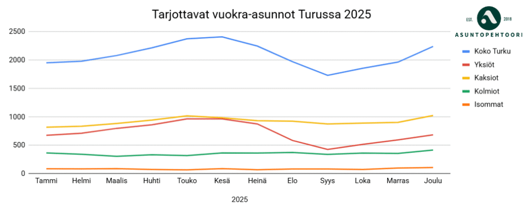 Kaikista näkyy selvästi kesän kysyntäpiikki, kun opiskelijat etsivät asuntoja saatuaan tiedon opiskelupaikasta. Tämän jälkeen kysyntä hiljenee, tasoittuu talveksi, ja kasvaa taas kesällä.